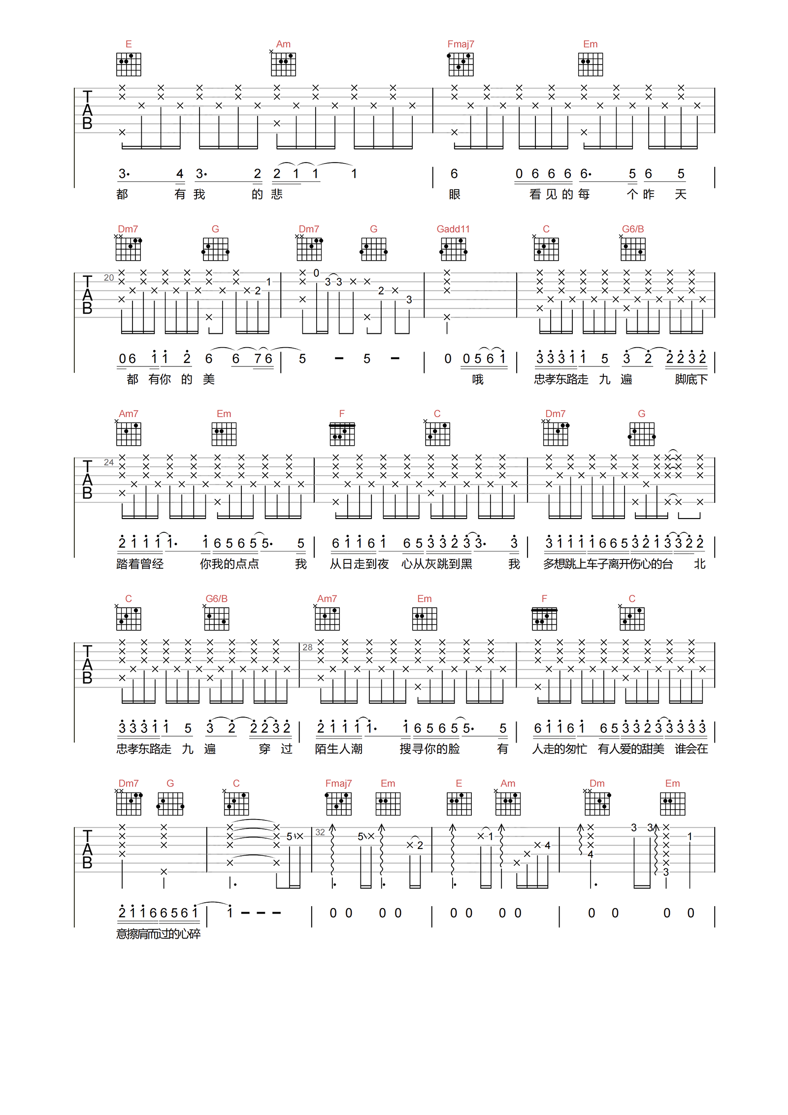 曲谱介绍: 忠孝东路走九遍吉他谱,动力火车演唱,源于动力火车当初收到一歌迷的信,诉说伤心爱情往事:忠孝东路曾有着频繁的感情痕迹,当爱情已不在的时候,他仍然在街上寻觅的徘徊着。而这些经历被浓缩成了歌词,动力火车也因此所感动,便创作了这歌。 《忠孝东路走九遍》吉他弹唱谱,选用C调指法,CAPO夹3品弹唱原调bE,节奏4/4拍,本谱含前奏按原版编配,难度3级较简单。另外在下方提供了PDF的版本下载。