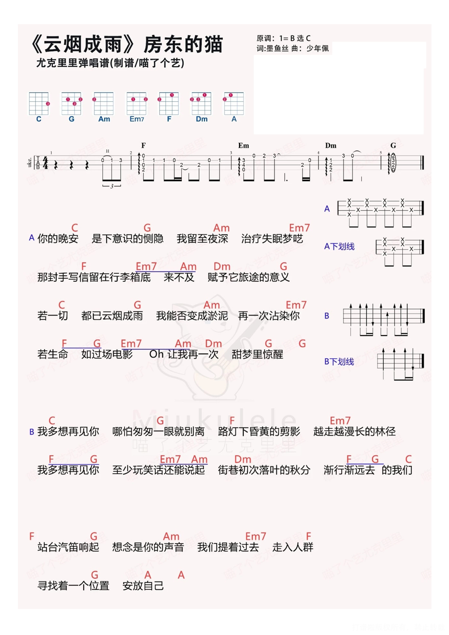 曲谱介绍: 房东的猫《云烟成雨》_C调尤克里里谱
