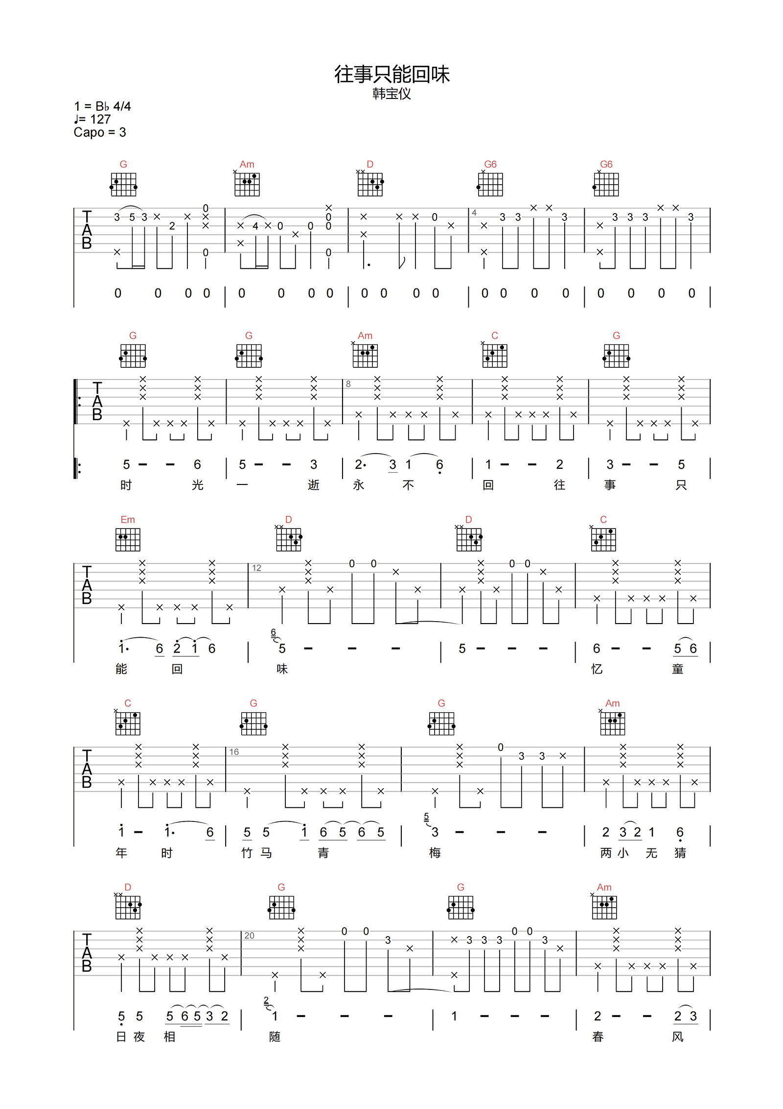 曲谱介绍: 往事只能回味吉他谱,韩宝仪演唱,《往事只能回味》是20世纪70年代歌,那些往事,独独都那么难以忘怀,曾经的梦想被生活蹂躏的支离破碎。随着旋律的逐渐传来,感慨生命都将变老,树叶都会凋落,年复一年,余味仍在。 《往事只能回味》吉他弹唱谱,选用G调指法,CAPO可夹3品处弹唱原调bB,节奏4/4拍,本谱按原版编配含完整前奏,难度3级较简单。下方附有曲谱的PDF版本下载。