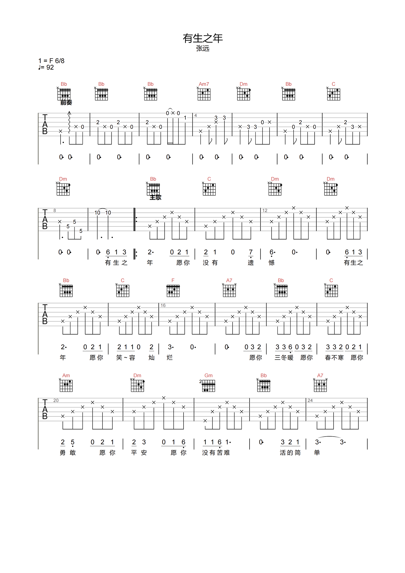 曲谱介绍: 有生之年吉他谱,张远演唱,时间在纷争中快速划过,我们总是发现难以摆脱遗憾,歌曲巧妙的地方是囊括了所有的祝福词,祝愿自己,也祝愿他人,是最合适的圆满。 《有生之年》吉他弹唱谱,选用F调指法编配,标准调音,无需使用变调夹,节奏6/8拍,难度3级较简单。随谱下方附有PDF版本下载,需要的琴友情注意一下。