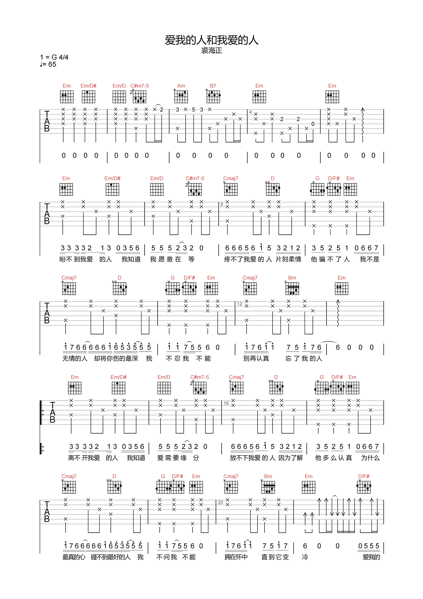 曲谱介绍: 爱我的人和我爱的人吉他谱,裘海正原唱的一首歌曲,游鸿明也有翻唱男声版。 《爱我的人和我爱的人》吉他弹唱谱,选用G调指法,标准调音,无需再使用变调夹,弹奏速度控制在65拍每分钟,节奏4/4拍,难度3级较简单。另外,在本页下方附PDF版本下载。