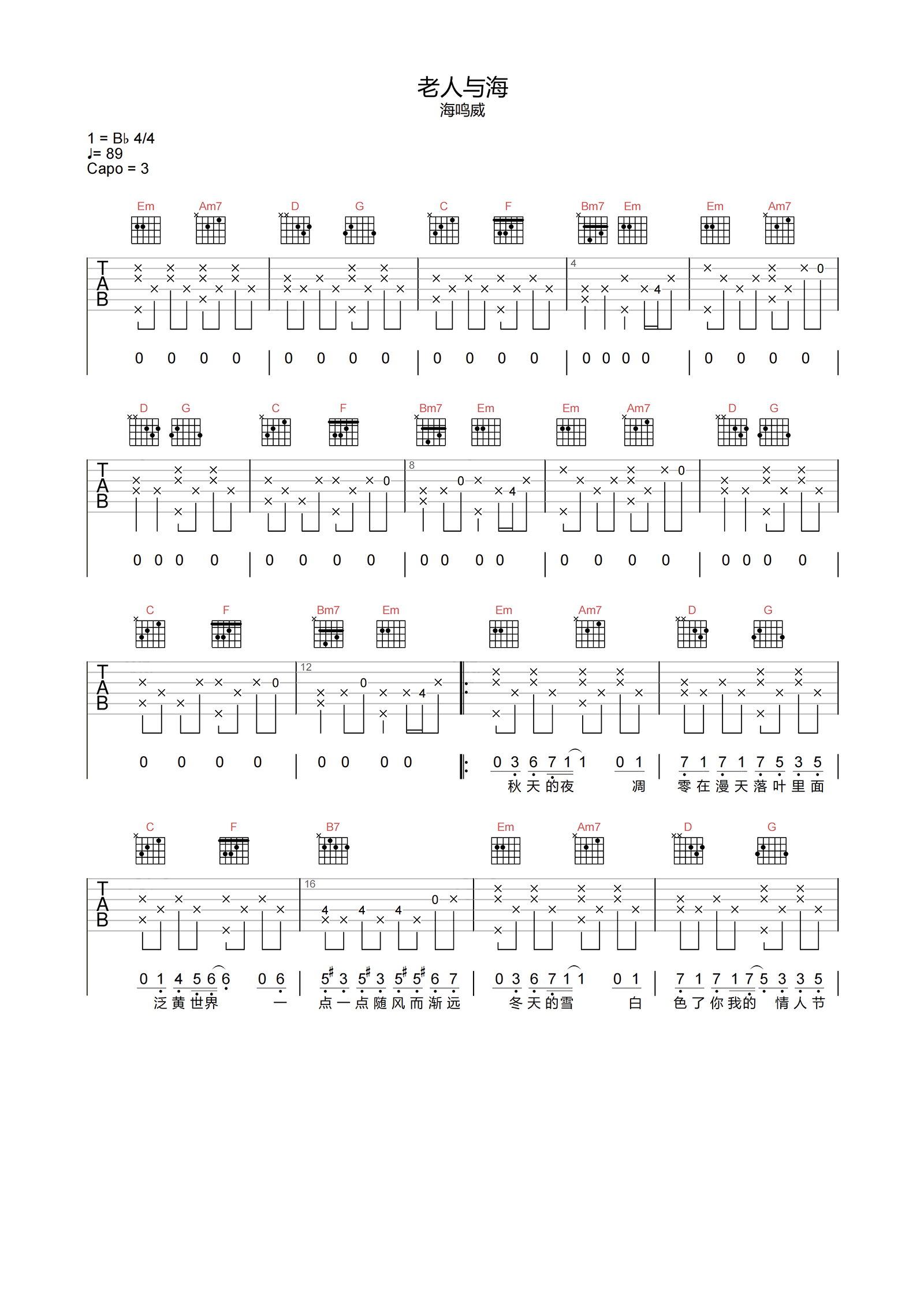 曲谱介绍: 老人与海吉他谱分享,由海鸣威演唱。《老人与海》吉他弹唱谱,选用G调编配,原调bB,推荐夹3品弹唱,节奏4/4拍,速度89BPM,难度3级较简单。本页下方附PDF版本下载。