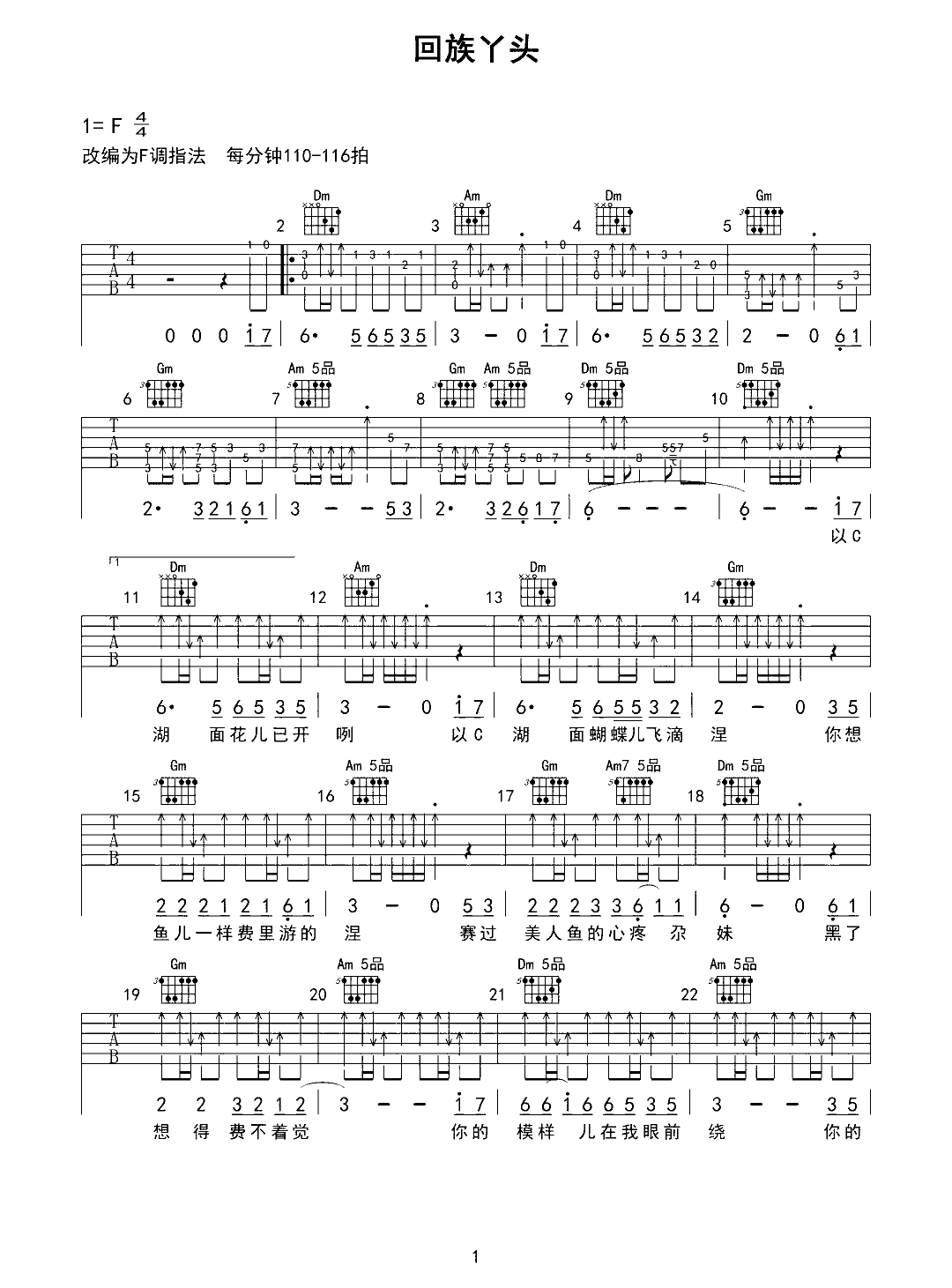 曲谱介绍: 回族丫头吉他谱,苏尔东演唱,节奏悦耳,再加上唯美意境,震撼人心的华尔兹舞曲调,深受大家的喜好。歌曲用作寄予找寻那个回族丫头的情结,加上动人的故事,让人沉醉愉快的视听享受中,浑然忘我的身心愉悦。 《回族丫头》吉他弹唱谱,选用F调指法编配,原调无需使用变调夹,速度控制在110-116拍每分钟,节奏4/4拍,难度6级较难。本页下方附曲谱的PDF版本下载。