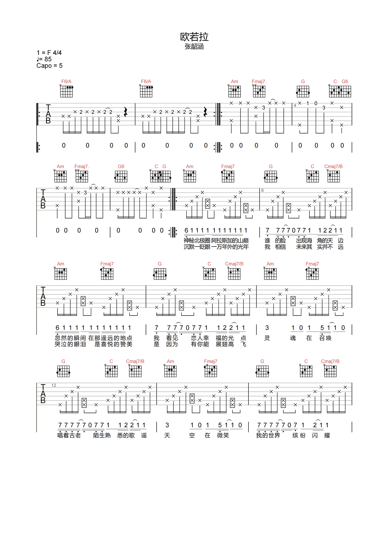 曲谱介绍: 欧若拉吉他谱,张韶涵演唱,是这首歌曲中的北欧神话故事中执掌北极光的女王,是罗马神话中的曙光女神。 《欧若拉》吉他弹唱谱,选用C调指法,CAPO夹5品弹唱原调F调,速度85BPM,节奏4/4拍,本谱带完整前奏和间奏,较接近原版,但建议可省略前面两小节,从第三小节往后延伸。需要PDF的可以在本页下方下载。