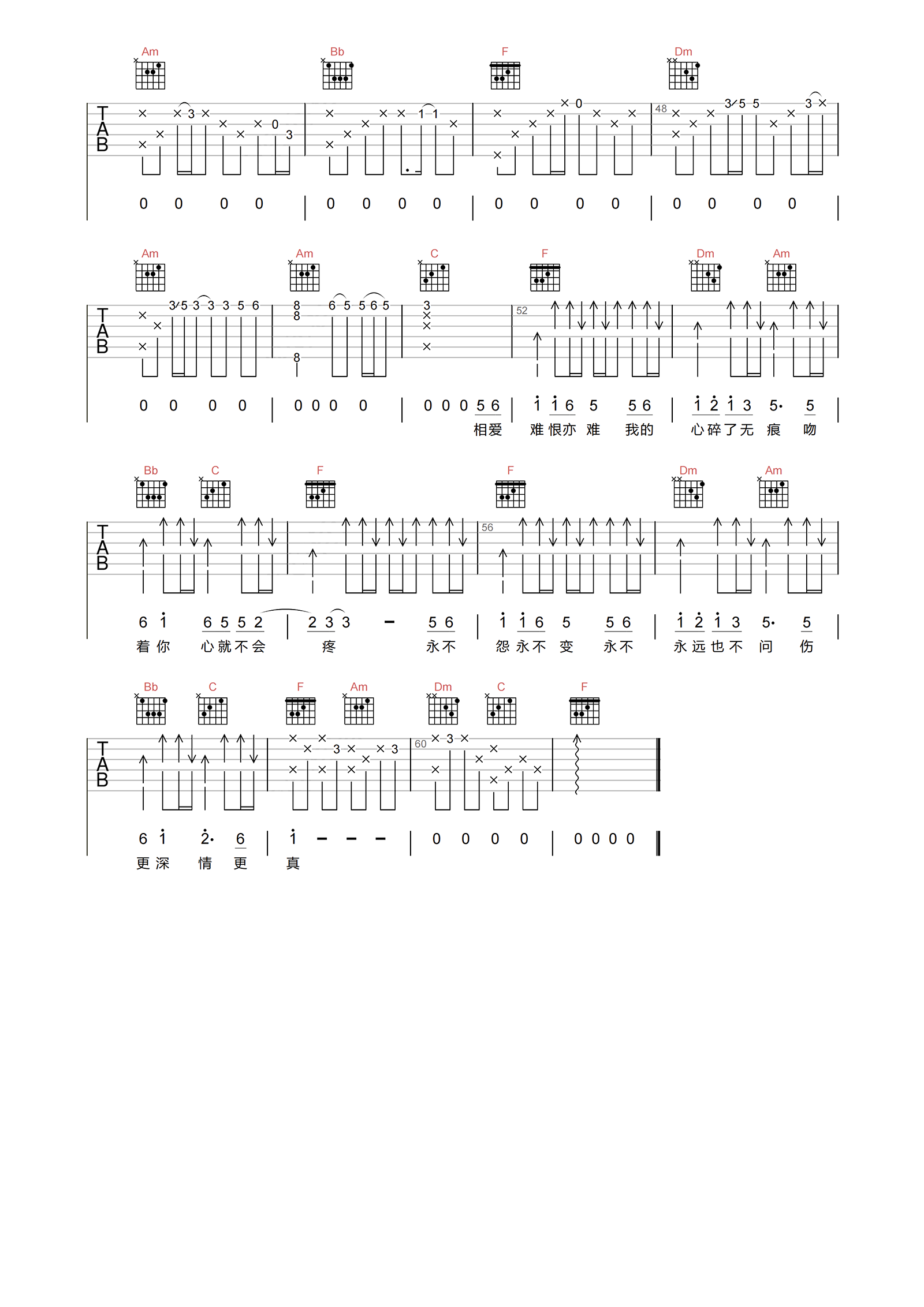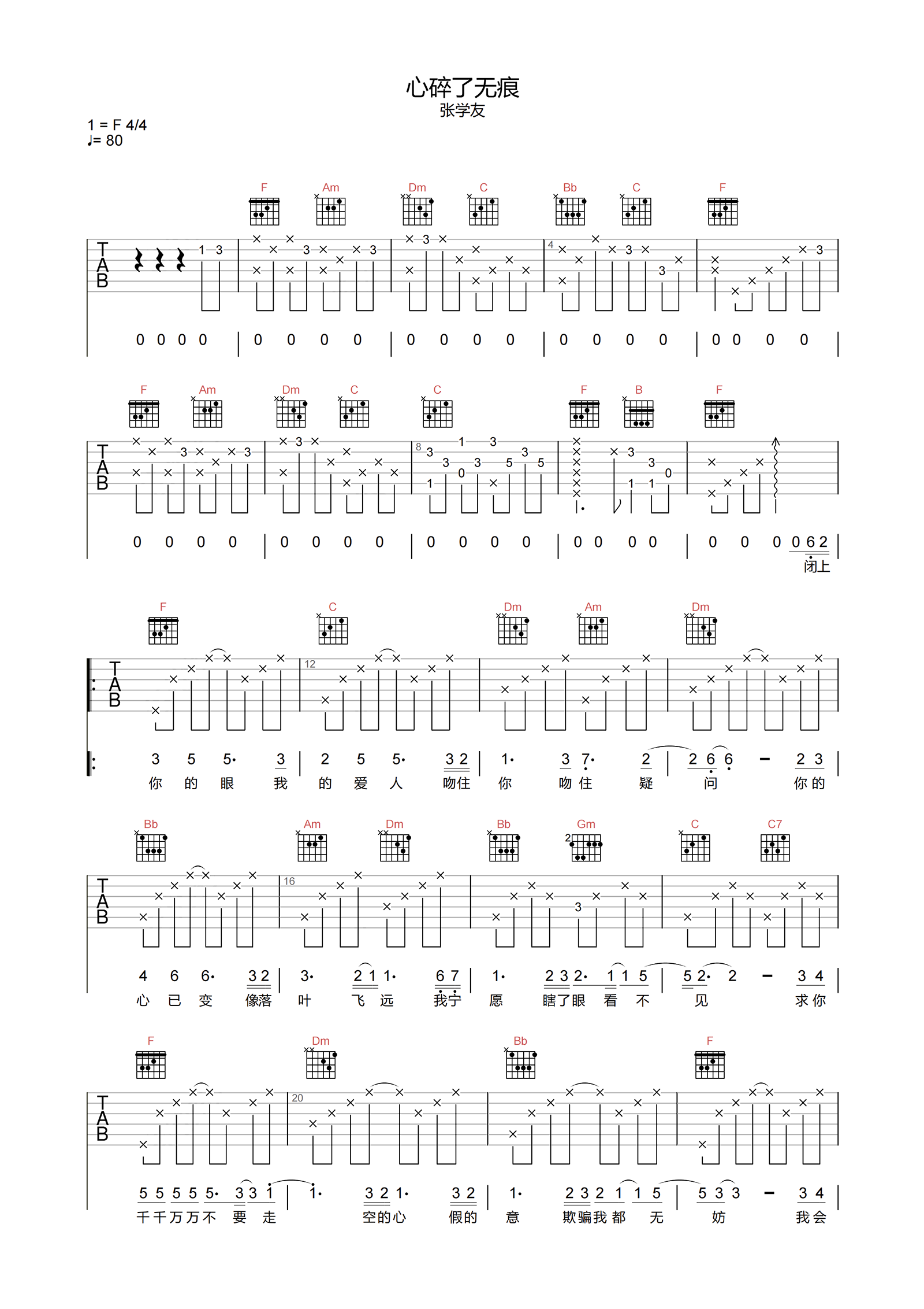 曲谱介绍: 心碎了无痕吉他谱,张学友演唱的国语伤感情歌。 《心碎了无痕》吉他弹唱谱,选用F调,弹唱速度控制80BPM,节奏4/4拍,包含完整前奏按原编配,难度3级较简单。本页下方附曲谱的PDF版本下载。