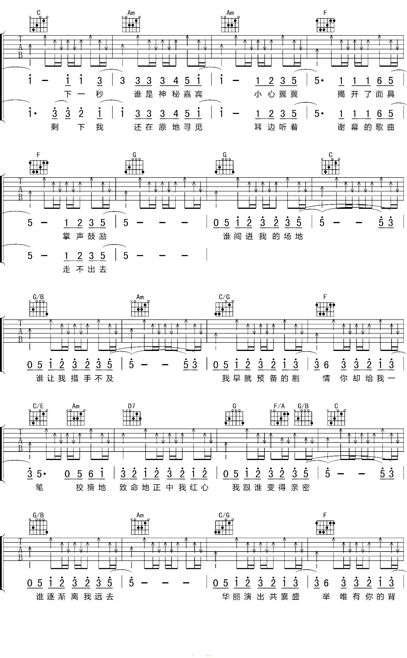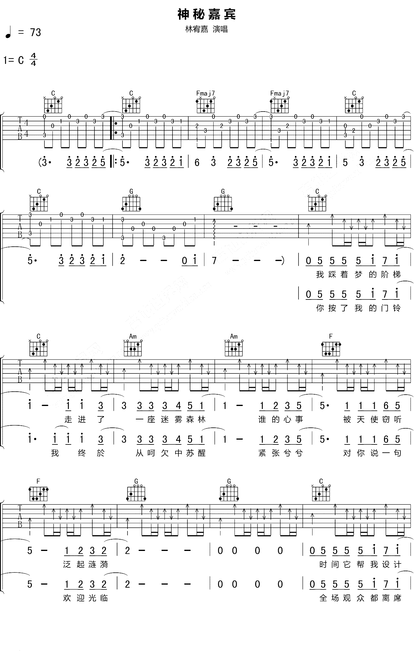 曲谱介绍: 神秘嘉宾吉他谱,由林宥嘉演唱。《神秘嘉宾》吉他弹唱谱,选用C调指法编配,无需使用变调夹,也可根据嗓音条件调整位置,弹唱速度73BPM,节奏4/4拍,含前奏原版编配,本页下方另外附PDF版本下载。