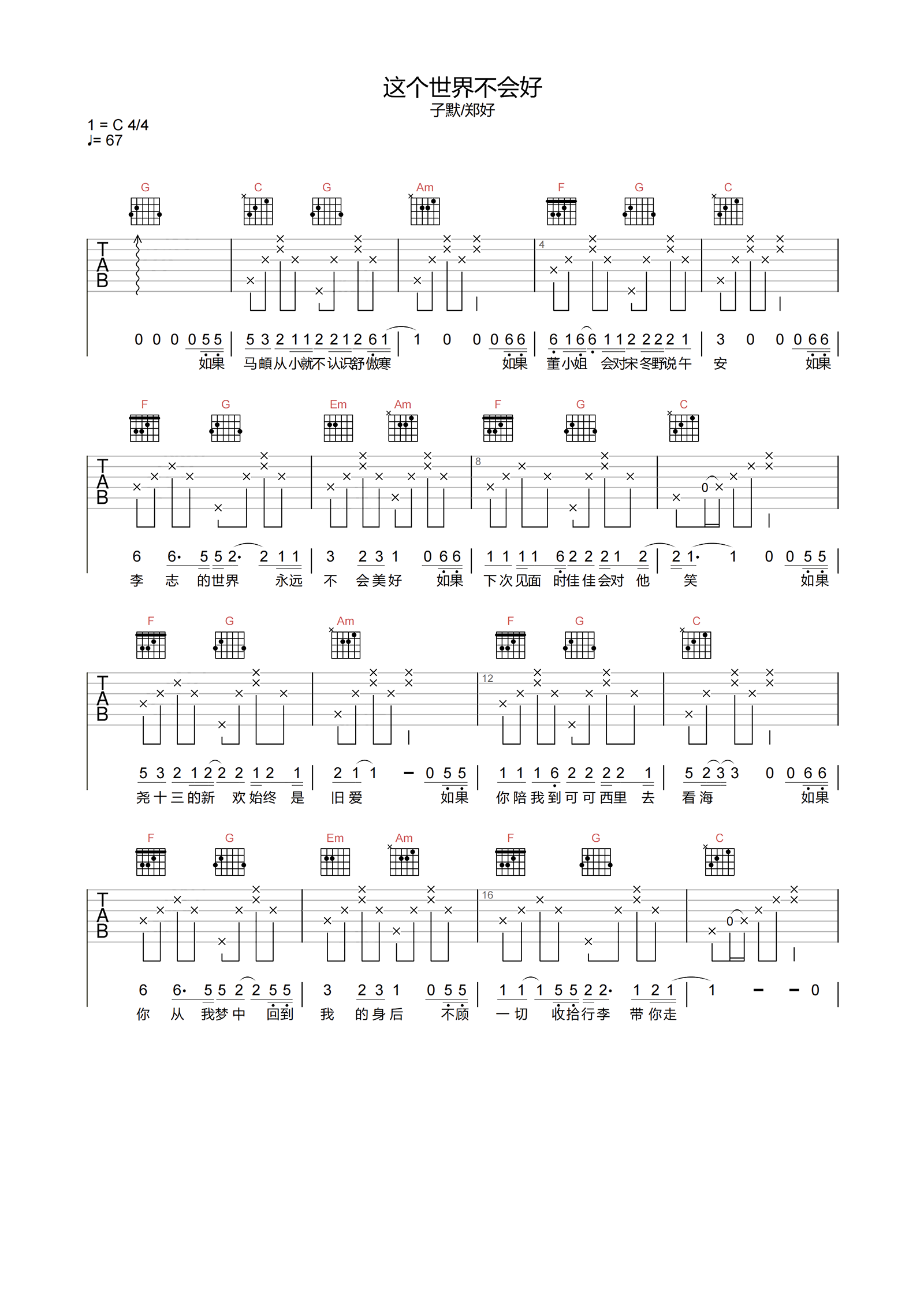 这个世界不会好吉他谱 - 子默/郑好 - C调吉他弹唱谱 - 原版