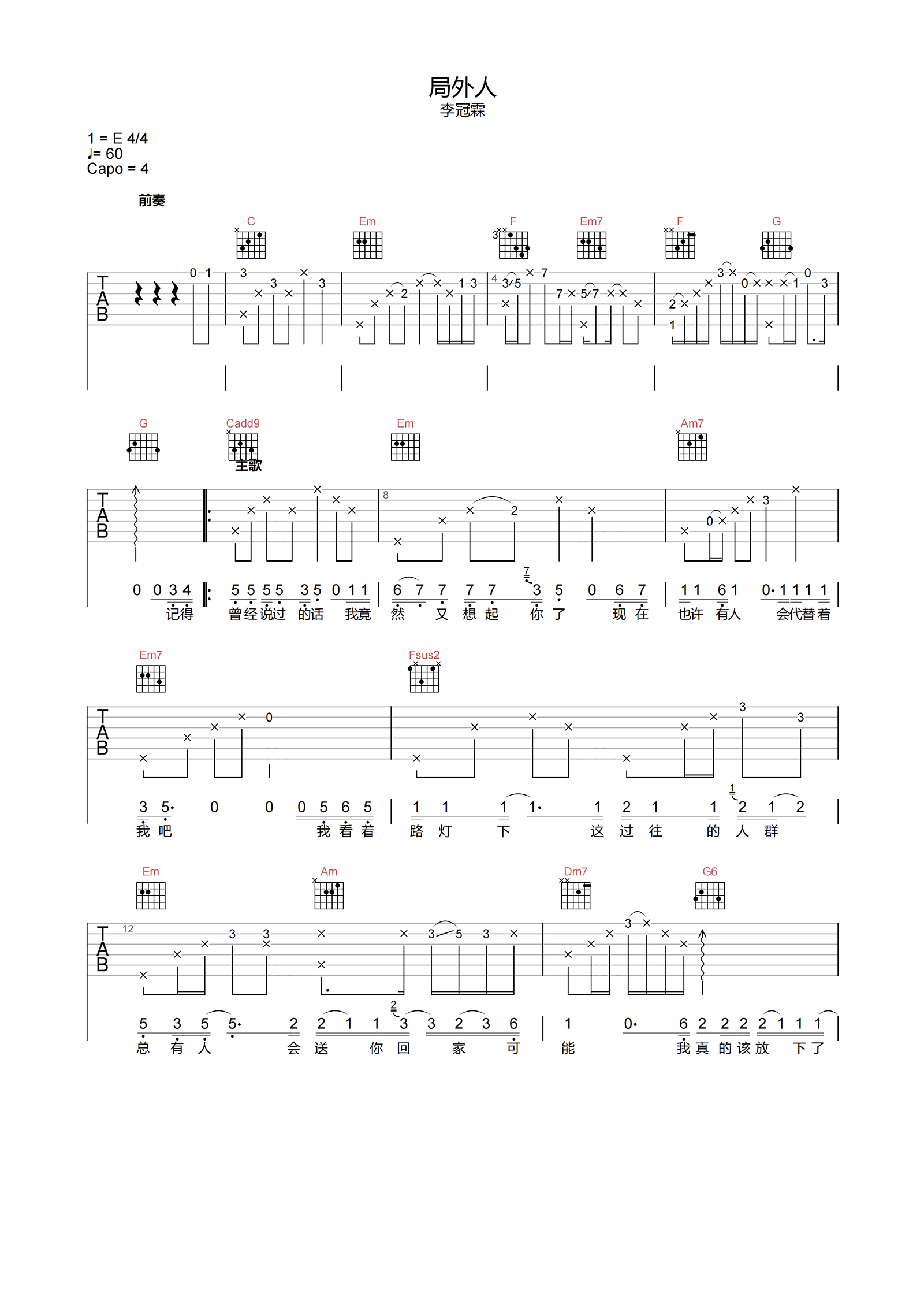 曲谱介绍: 《局外人》吉他谱,李冠霖演唱的一首歌曲,《局外人》吉他弹唱谱,选用C调指法编配,CAPO夹4品弹唱原调E调,速度60BPM,节奏4/4拍,弹唱难度5级适中,本页下方附曲谱PDF下载。