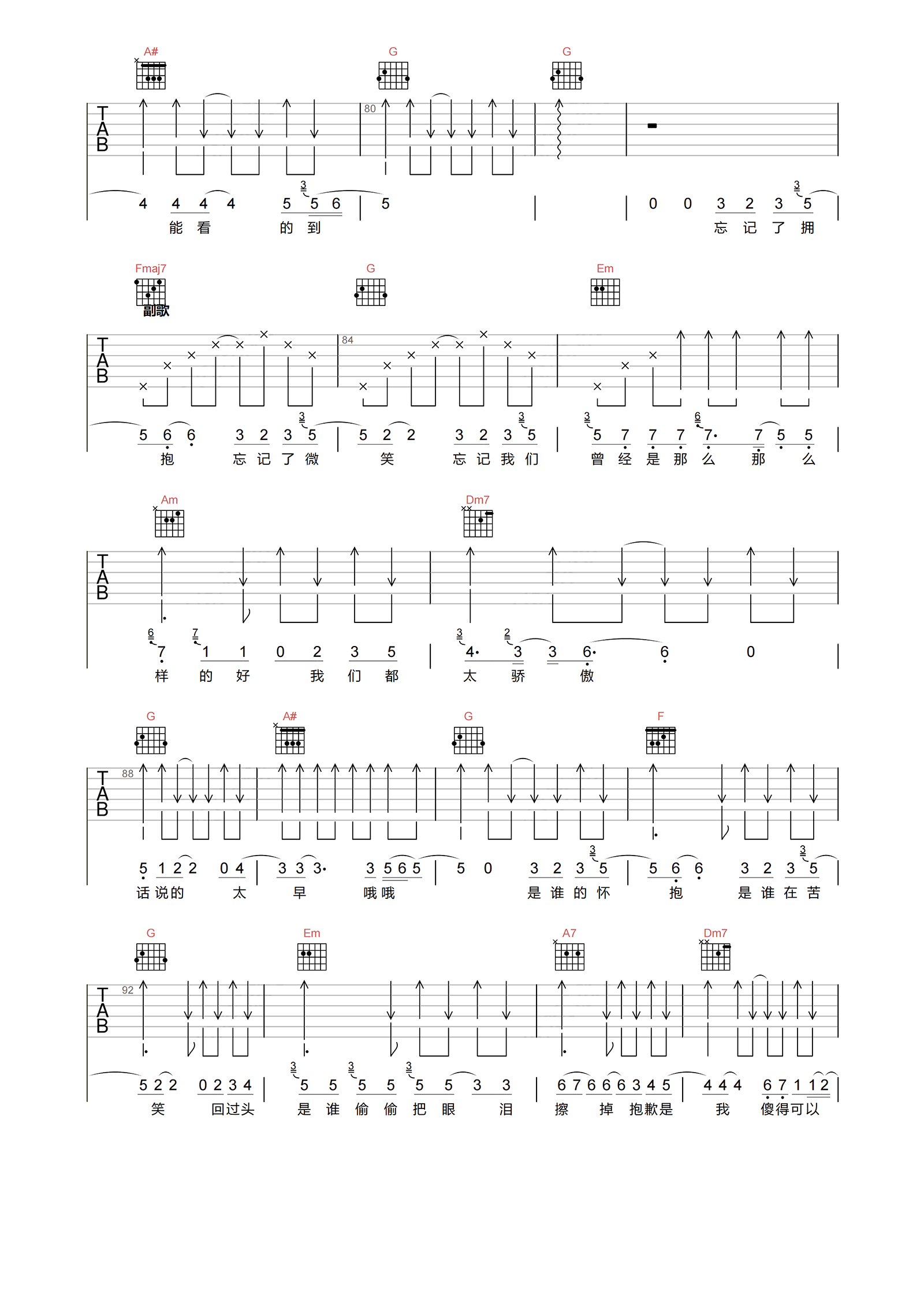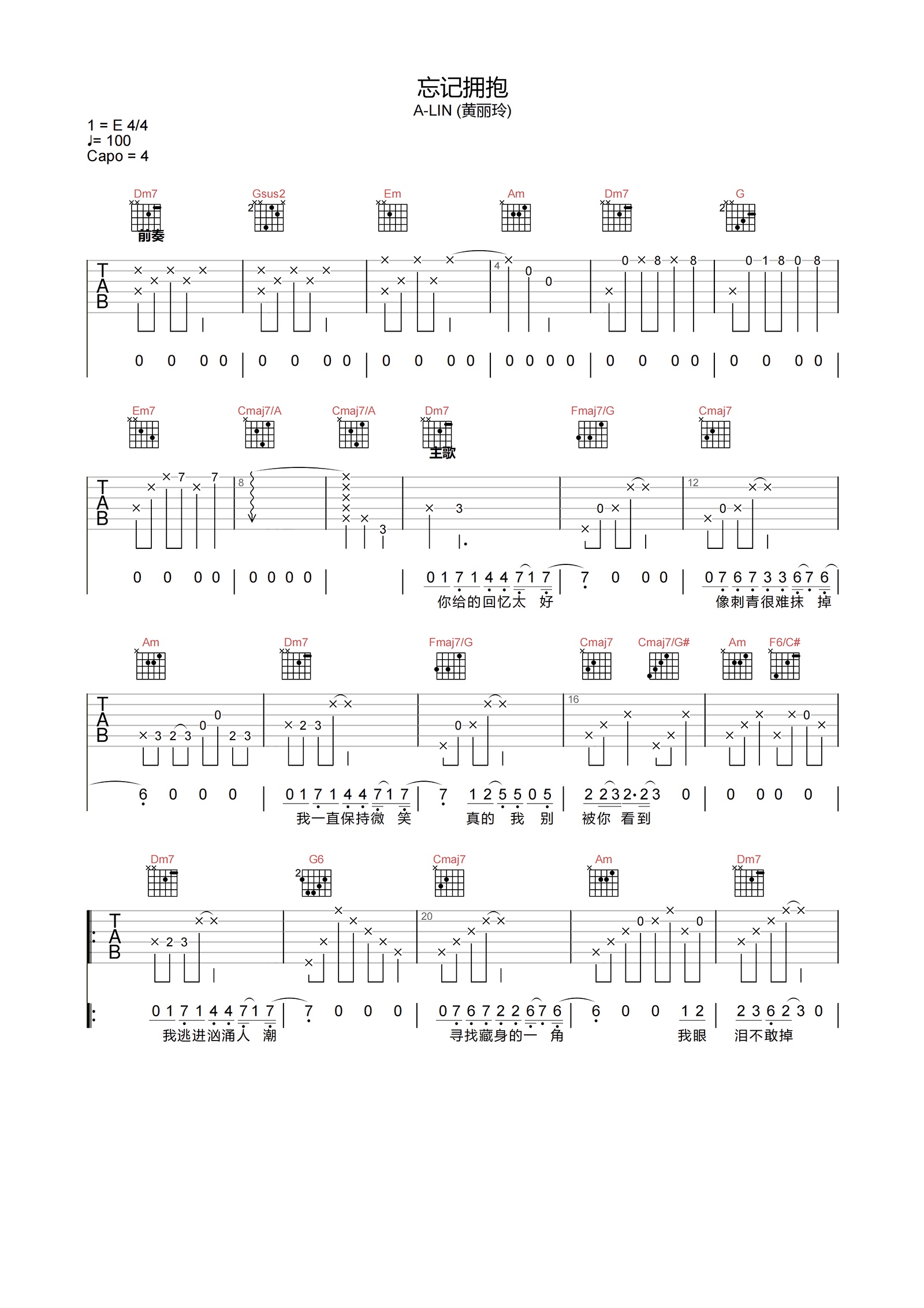曲谱介绍: 《忘记拥抱》吉他弹唱谱,选用C调指法,CAPO夹4品弹唱原调,节奏4/4拍,速度100BPM,难度3级较简单。共6张高清图片谱例,本页下方附曲谱PDF版本下载。