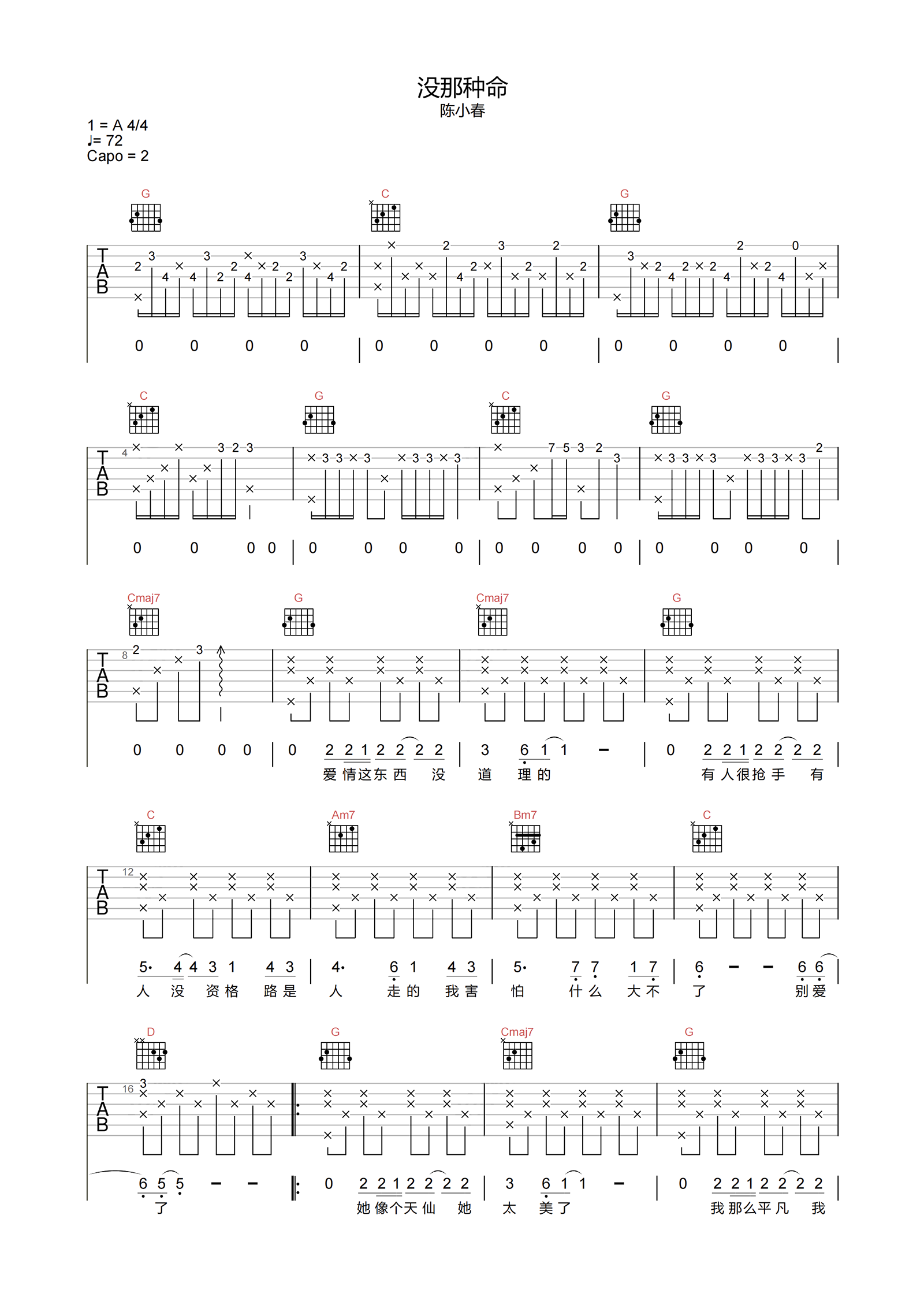 曲谱介绍: 没那种命吉他谱,陈小春演唱,算是男人苦情歌的代表曲目之一了,缘分虽由天注定,但有的人注定更抢手,有的人却没有资格,歌曲点出了许多男人没法和心爱的人在一起的内心共鸣,伤感但很治愈。 《没那种命》吉他弹唱谱,选用G调指法编配,CAPO夹2品弹唱原调,节奏4/4拍,速度72拍每分钟,本谱带前奏/间奏按原版编配,难度5级适中。另外在下方提供了曲谱的PDF版本下载。