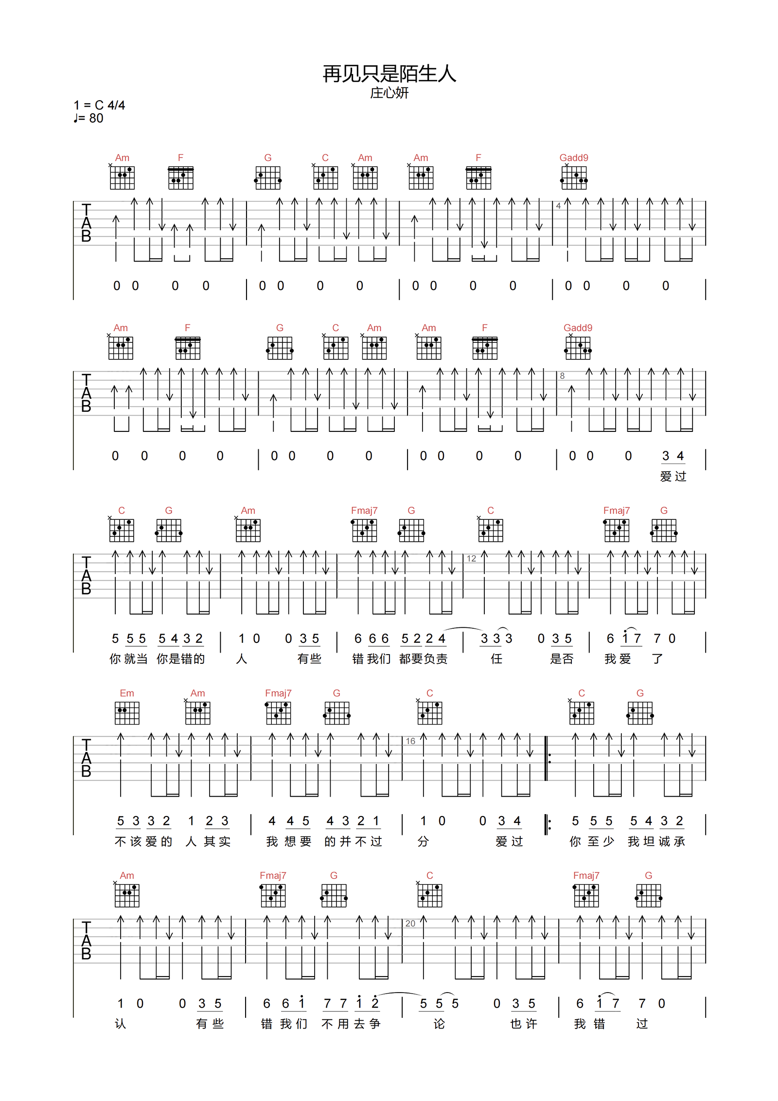 曲谱介绍: 《再见只是陌生人》吉他谱,庄心妍演唱,这首歌在网络上的传唱度十分之高,对感情洒脱的表达形式似乎引起了每个人的注意,都希望将心底曾经爱情受伤的模样用最真实的方式表现出来:爱情已逝去,再见即路人。 《再见只是陌生人》吉他弹唱谱,选用C调指法,速度控制80BPM,节奏4/4拍,全曲扫弦完整原版编配,难度3级较简单。本页下方附曲谱PDF版本下载。
