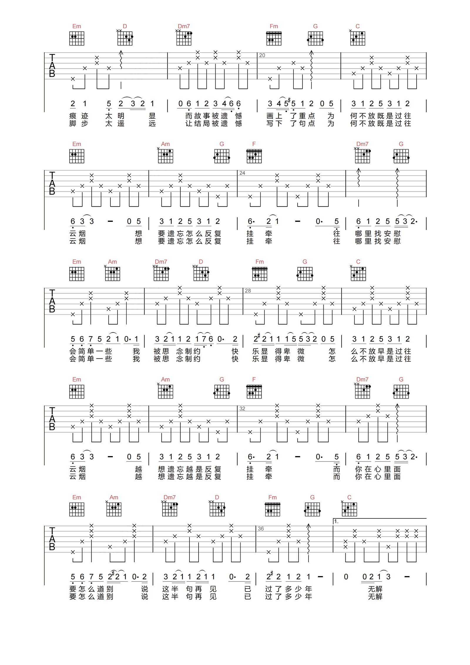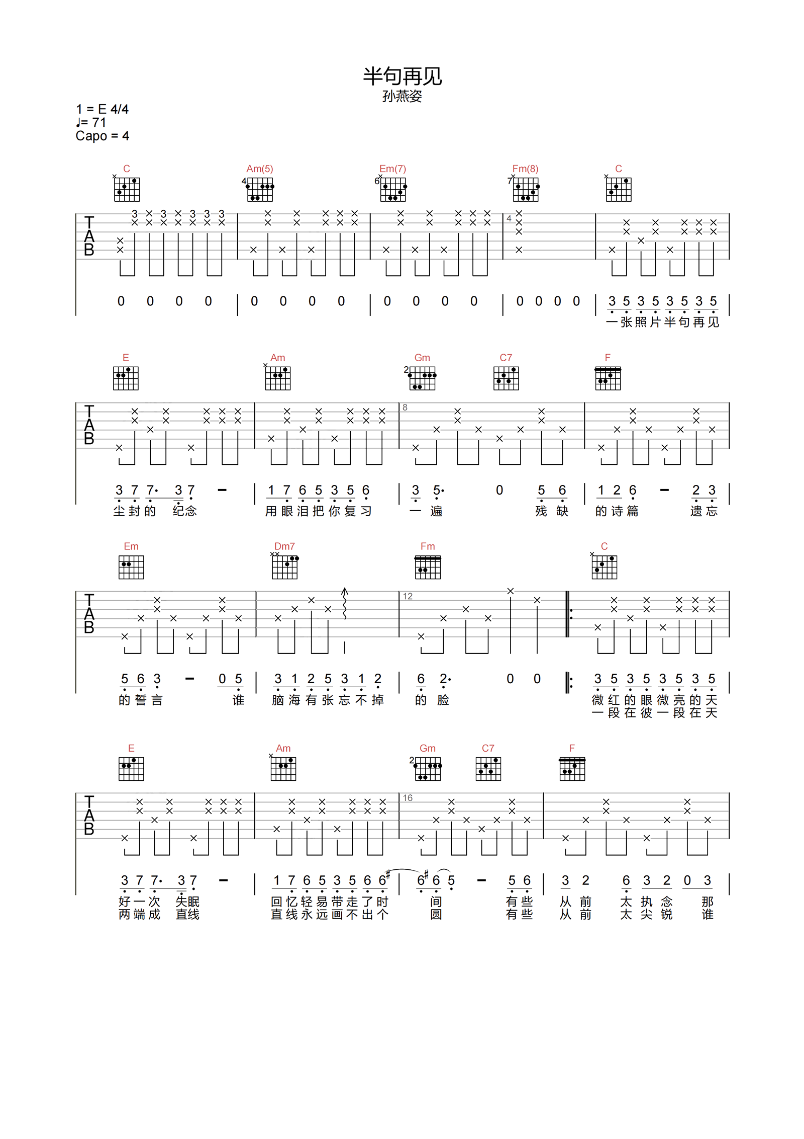 曲谱介绍: 《半句再见》吉他谱,吴子云作词、李偲菘作曲,孙燕姿演唱,也是《六弄咖啡馆》电影主题曲,“半句再见”诠释着更多情感拉扯中的叹息,明明看透了一切,但是却放不下那些过往的云烟。 《半句再见》吉他弹唱谱,选用C调指法,CAPO夹4品弹唱原调E调,节奏4/4拍,速度71拍每分钟,难度2级简单。本页下方附曲谱的PDF版本下载。