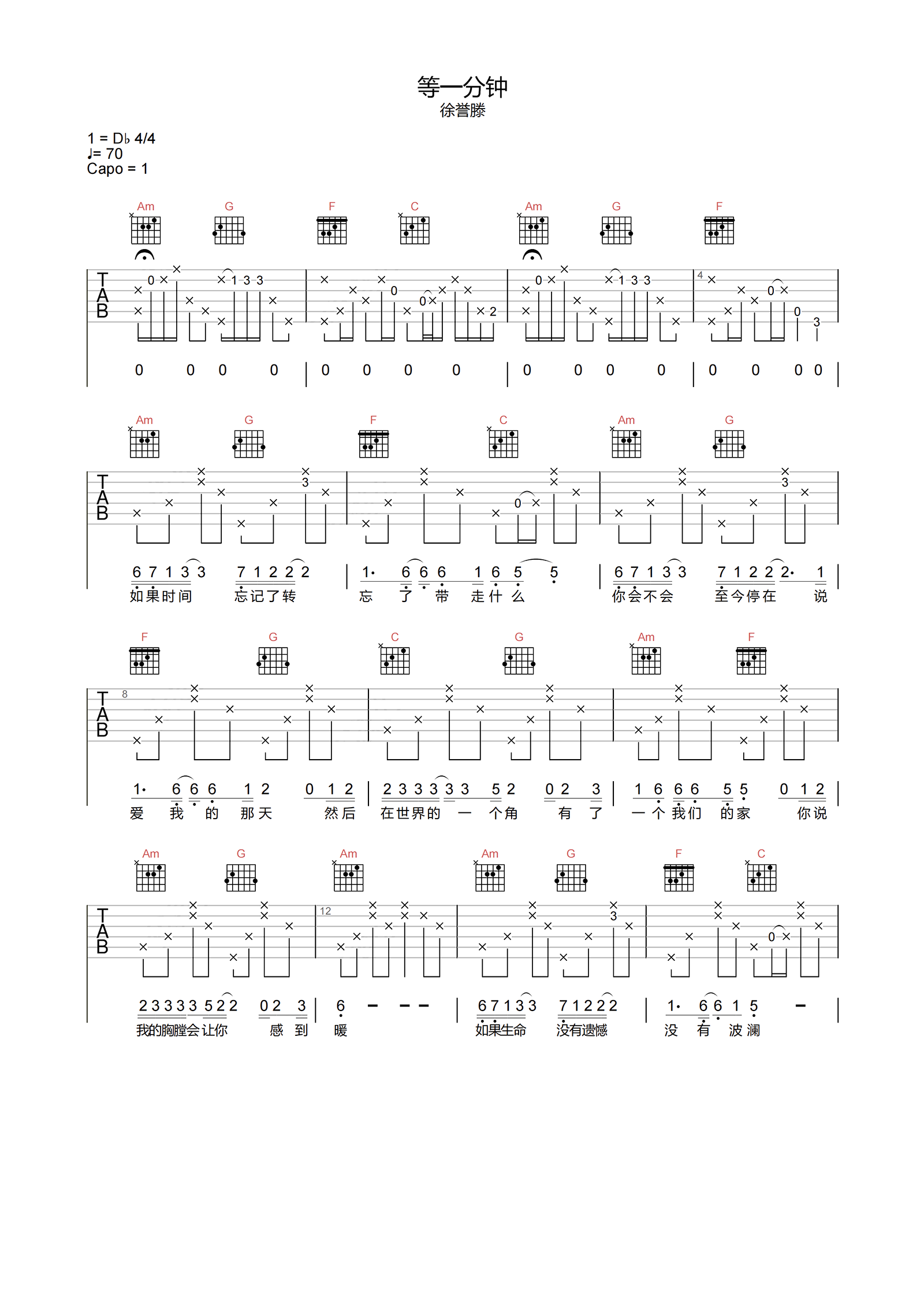 曲谱介绍: 《等一分钟》吉他谱,徐誉滕演唱,根据他自身真实故事所改编的歌曲,通过歌曲告诉我们:一分钟的时间并不长,也许就是我们发一小会呆的时间,但是这一分钟却可以化解很多的误会,而这一分钟却让两个原本相爱的人更加相爱或者就此永别! 《等一分钟》吉他弹唱谱,选用C调指法,原调bD,建议CAPO夹1品可弹回原调,节奏4/4拍,速度70BPM,带前奏按原版编配,难度3级较简单。另外,在本页下方附曲谱PDF下载。 吉他谱详情