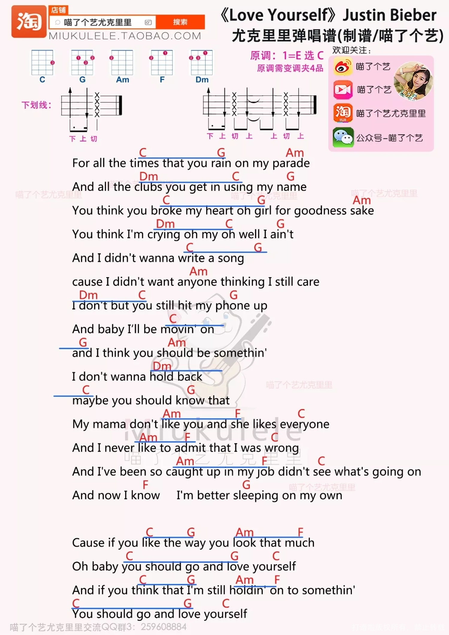 曲谱介绍: Justion Bieber《love yourself》_C调尤克里里谱