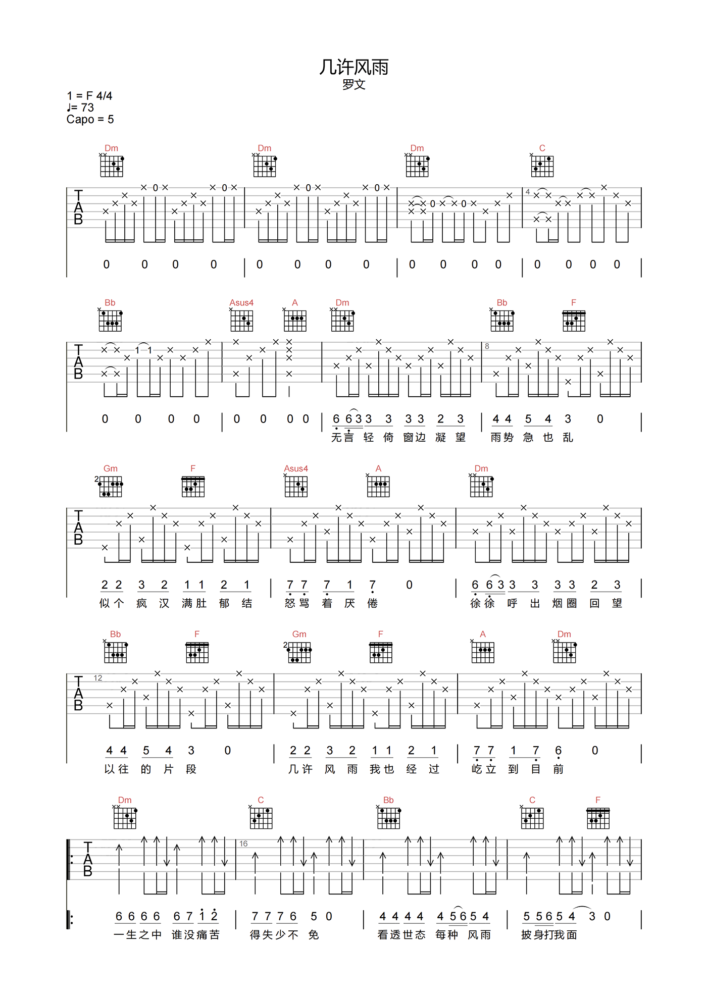 曲谱介绍: 罗文《几许风雨》吉他谱,选用C调指法,原调F调,CAPO推荐5品,节奏4/4拍,速度73拍每分钟,带前奏原版编配,难度4级较简单。本页下方附曲谱PDF下载。