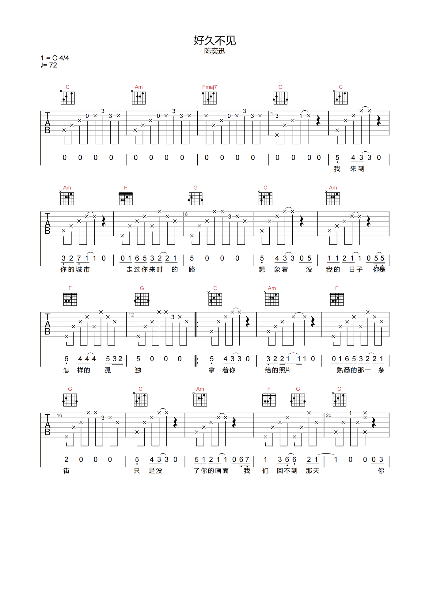 曲谱介绍: 陈奕迅的这首《好久不见》,旋律舒缓,讲的是情侣的吵架冷战,好似一部电影。陈奕迅就像一个娓娓道出的叙述者,用撕哑落寞声音诠释着对于感情感到遗憾的情歌。简单的钢琴和弦乐慢慢地和着,心情就似流水歪斜而过,直达人的心里。 陈奕迅《好久不见》吉他谱,选用C调指法编配,标准调音可根据嗓音微调变调夹位置,节奏4/4拍,速度72BPM,带前奏原版编配,难度3级较简单。下方附本曲谱的PDF下载。