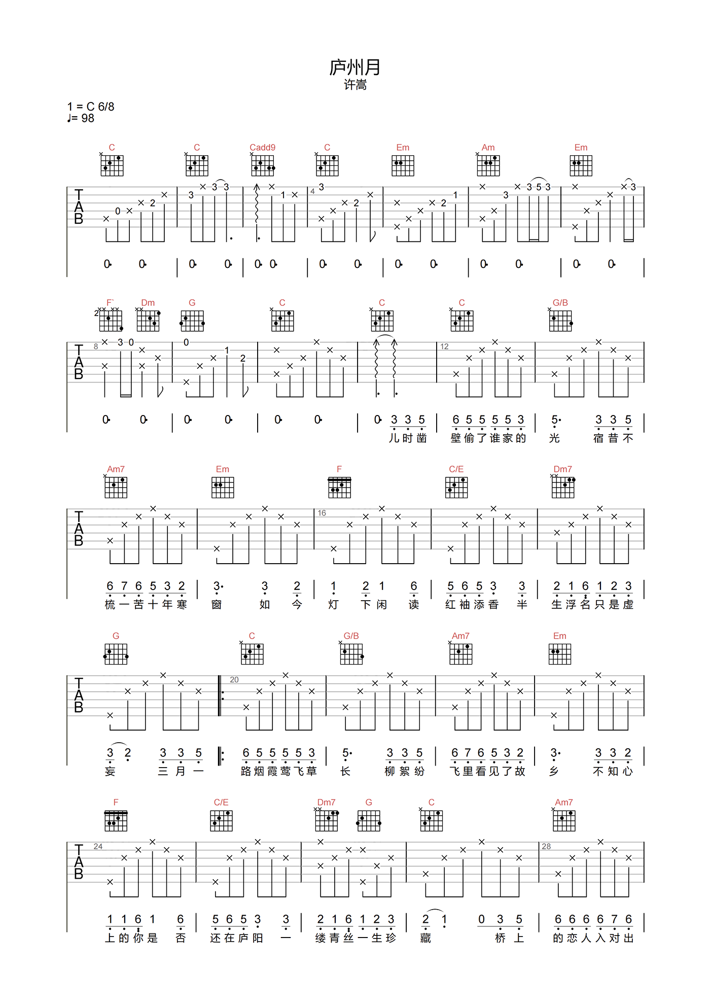 庐州月吉他谱 - 许嵩 - C调吉他弹唱谱 - 原版