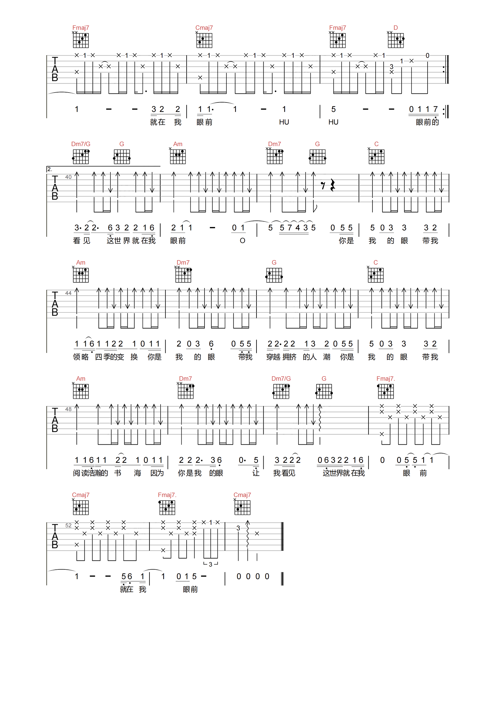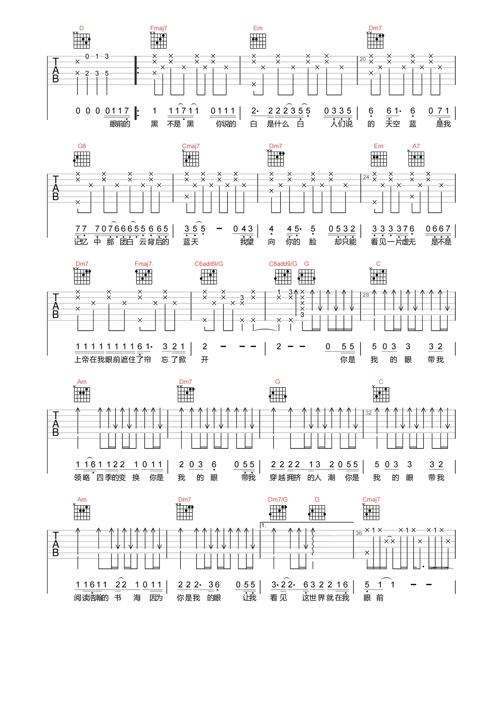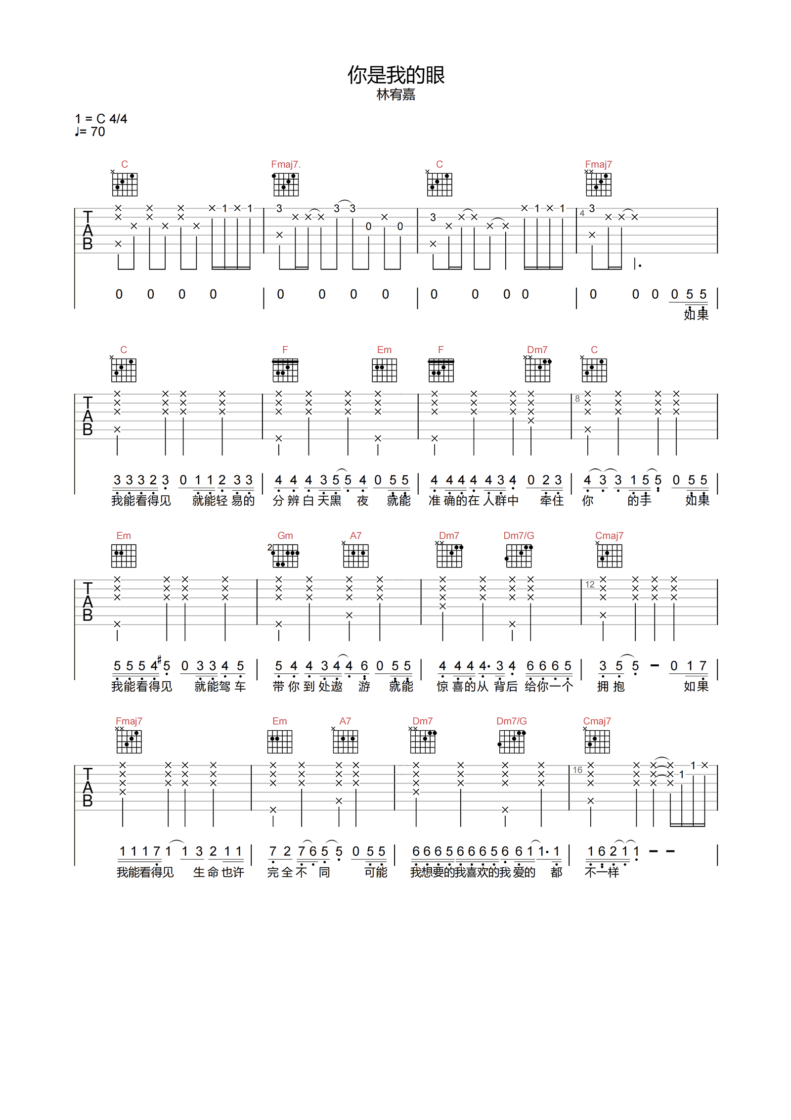 曲谱介绍: 《你是我的眼》是由林宥嘉演唱的版本,原本是由萧煌奇创作及原唱。温柔细腻的嗓音,用他自己的方式诠释了关于萧煌奇自身背后故事的情感与理解。“你是我的眼,带我领略四季的变换”,这首让我们越听越伤感! 林宥嘉《你是我的眼》吉他谱,选用C调指法,标准调音无需变调夹,也可根据嗓音条件适当调高品位,速度70BPM,节奏4/4拍,带前奏完整原版编配。另外,在下方附本谱PDF下载。