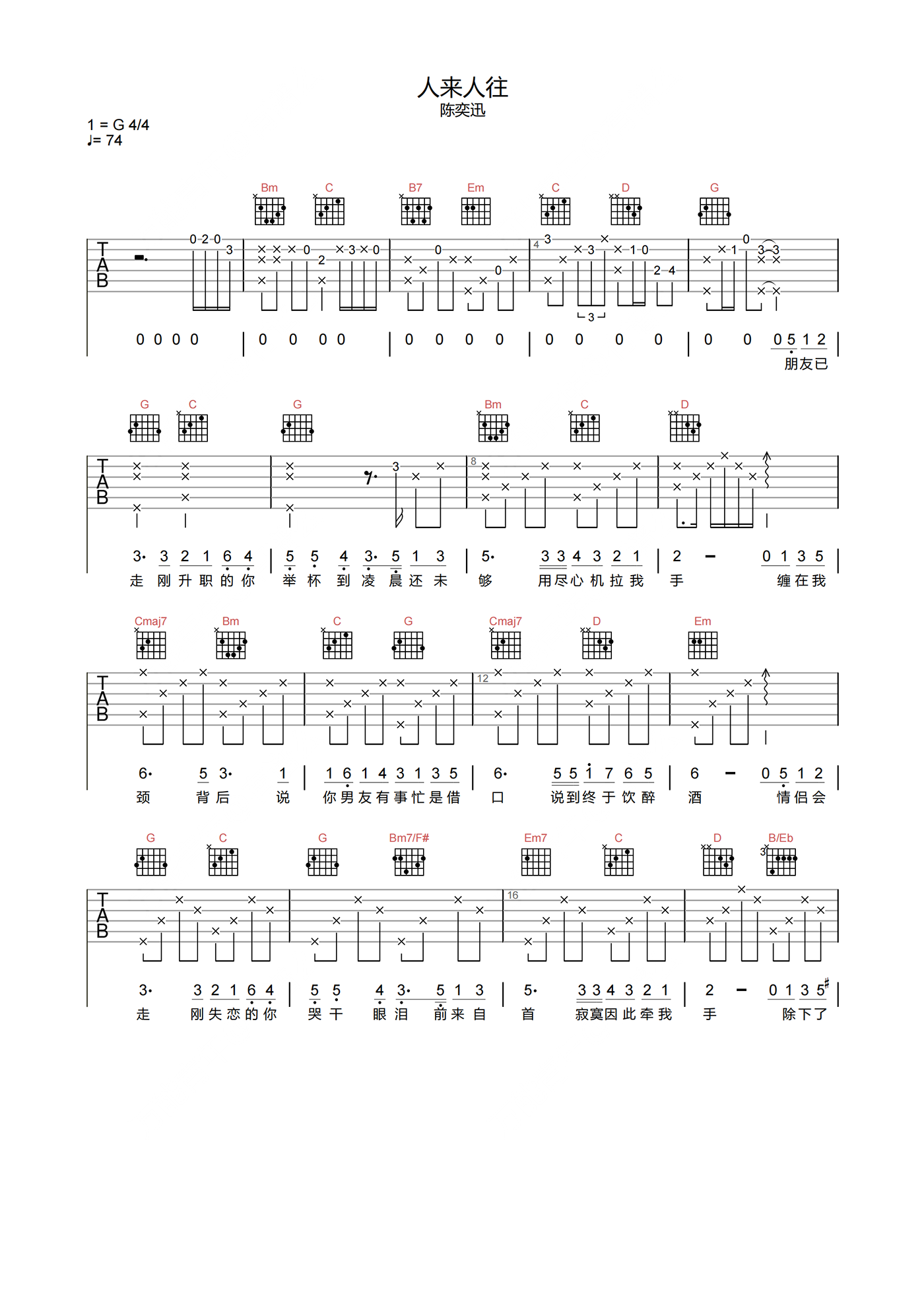 曲谱介绍: 歌曲《人来人往》总结出来的是爱情之中的心路历程的经历,秉持着看透情感,写出失去了所爱时的洒脱心情。 陈奕迅《人来人往》吉他谱,选用G调指法,标准调音,带前奏按原版编配,节奏4/4拍,速度74BPM,难度4级较简单,本页下方附曲谱PDF下载。