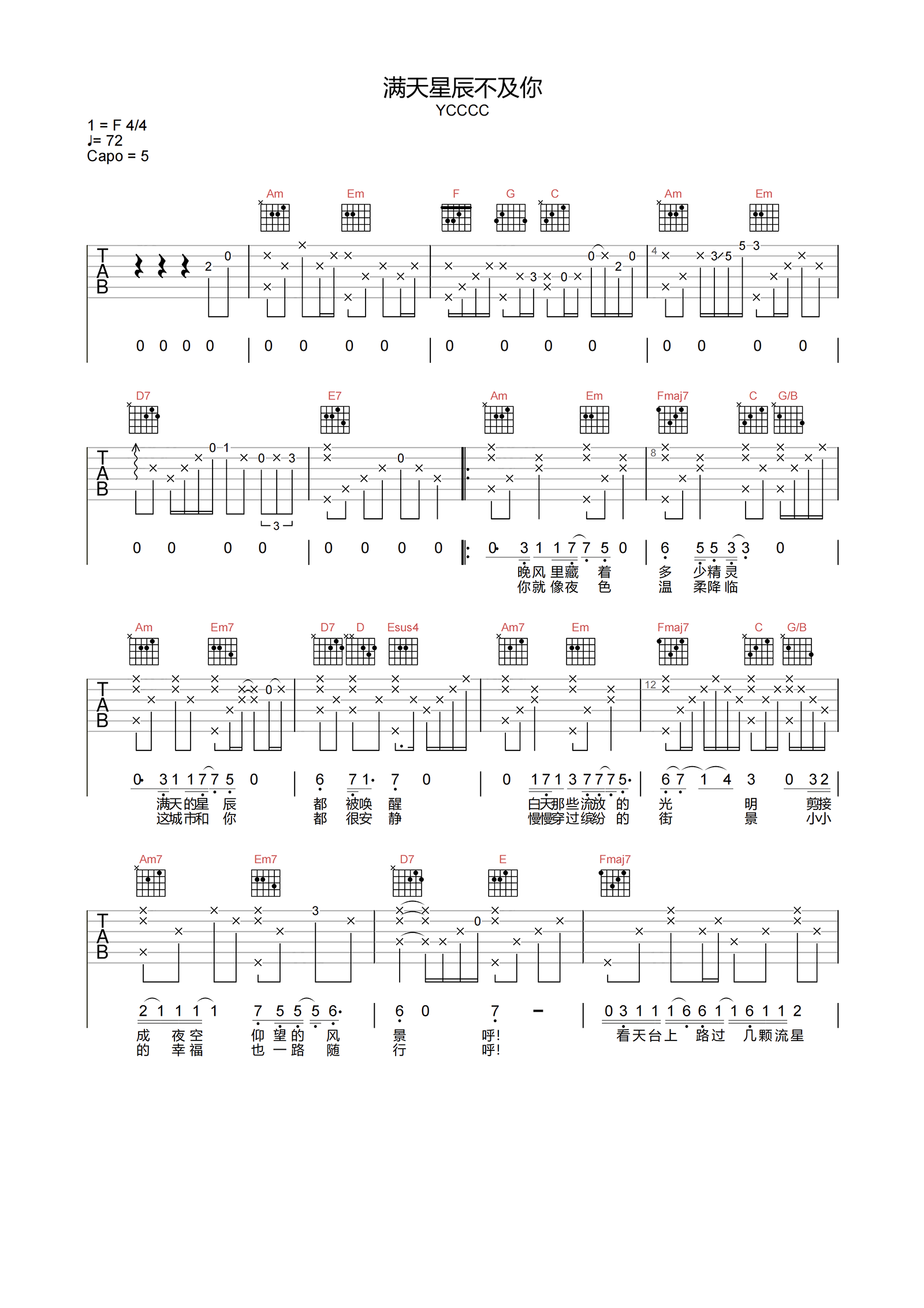 曲谱介绍: 《满天星辰不及你》由YCCCC演唱的歌曲,唯美的旋律配合着浪漫的造词,将歌曲刻画得十分的妙曼,天际的星光落入你的眼眸之间,但都不如你的浪漫,用歌曲诠释着一切美好与畅想。 YCCCC《满天星辰不及你》吉他谱,选用C调指法,CAPO夹5品弹回原调,节奏4/4拍,速度72BPM,带前奏和尾奏的原版编配。页面下方附本谱的PDF下载。