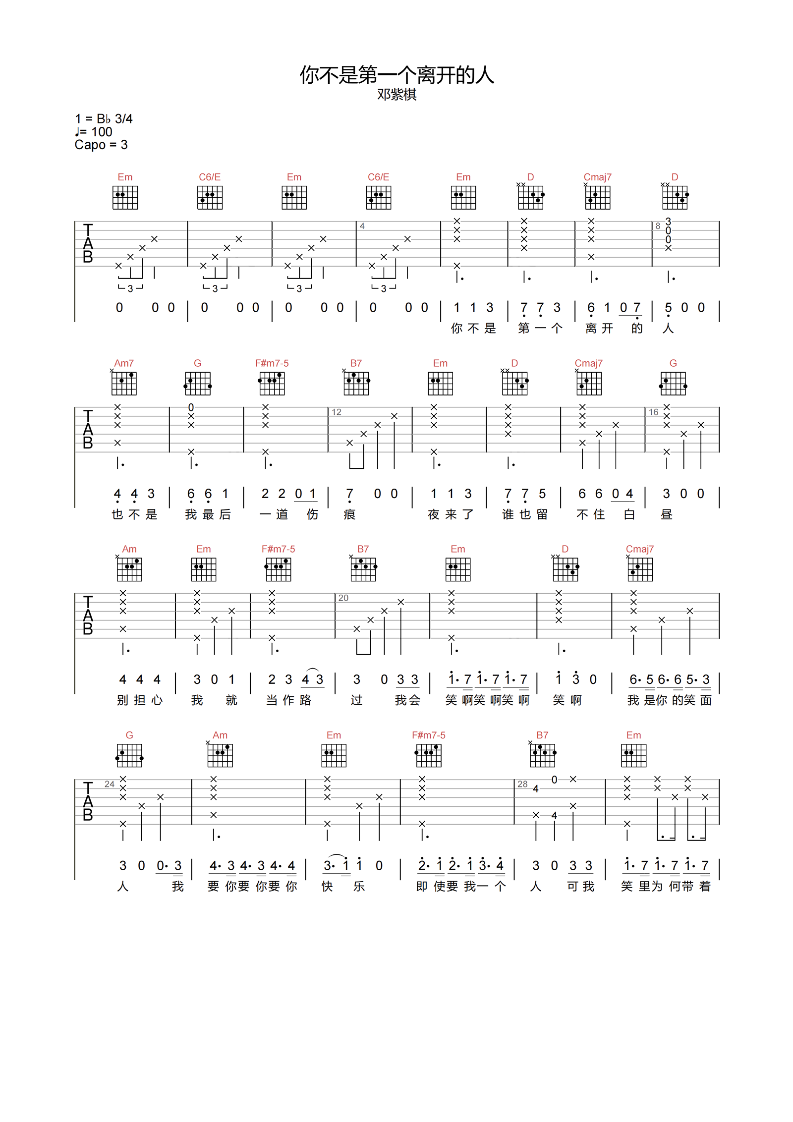 曲谱介绍: 《你不是第一个离开的人》是邓紫棋作词作曲并演唱。歌曲像是一个心路历程的变化,正如一段恋爱中所经历的欢喜、忐忑、冒险、失望、陌生。歌曲本身刻画的人物也感觉是在周旋、失望、深刻、难以忘记。 邓紫棋《你不是第一个离开的人》吉他谱,选用G调指法,CAPO夹3品弹唱原调bB,节奏3/4拍,速度100BPM,按完整版编配,弹唱难度3级较简单,本页下方附曲谱的PDF版本下载。