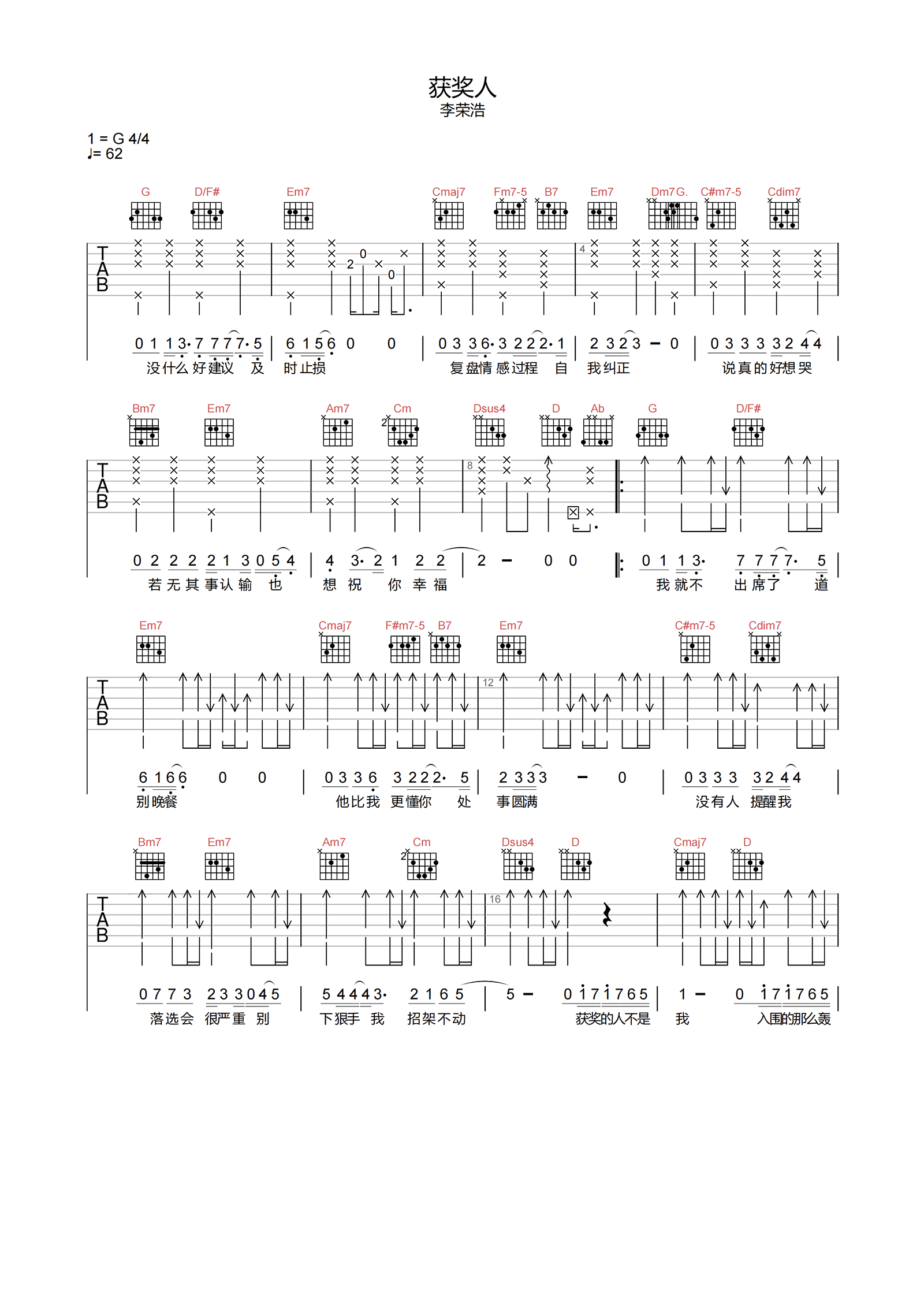 获奖人吉他谱 - 李荣浩 - G调吉他弹唱谱 - 原版