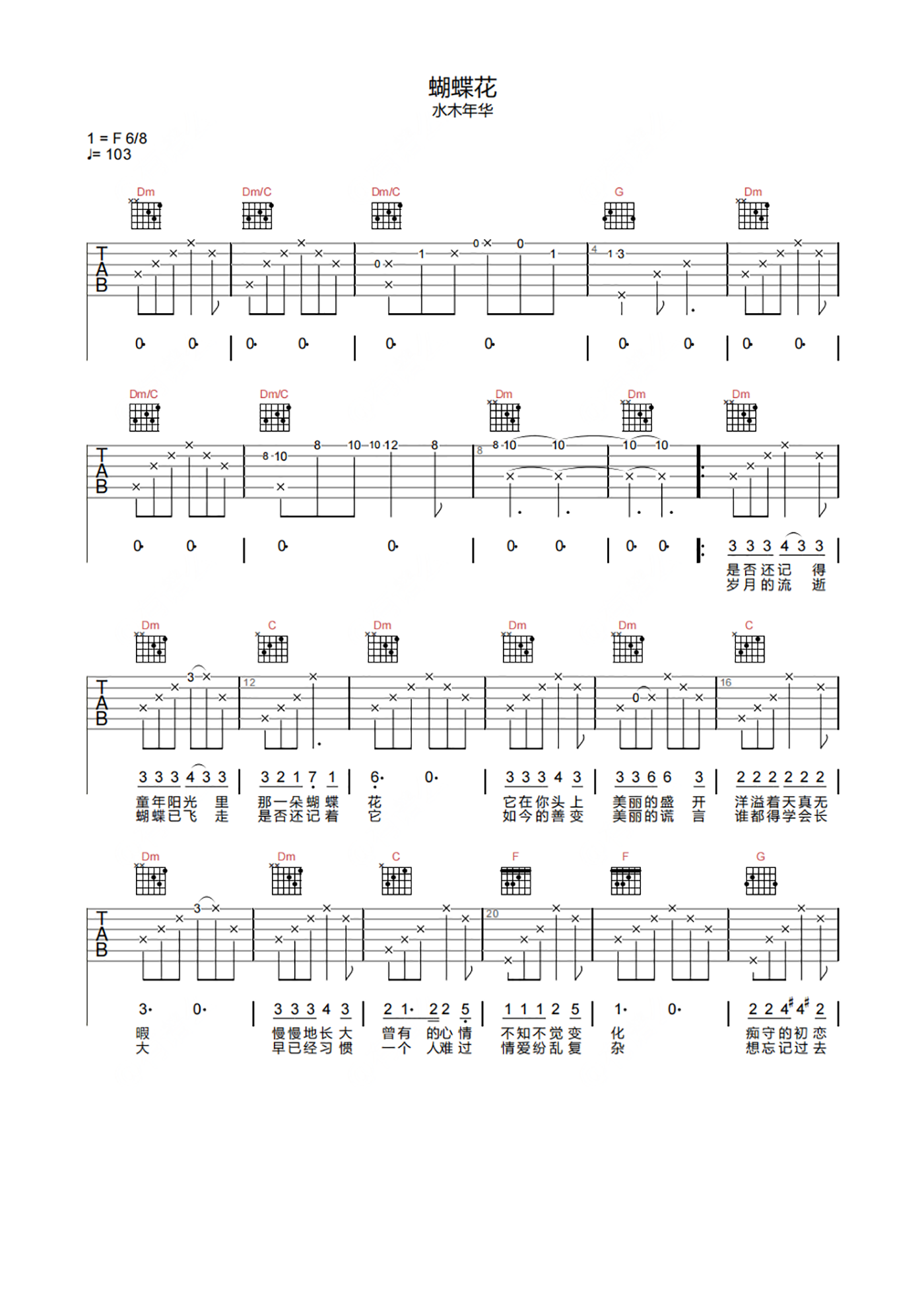 蝴蝶花吉他谱 - 水木年华 - C调吉他弹唱谱 - 原版