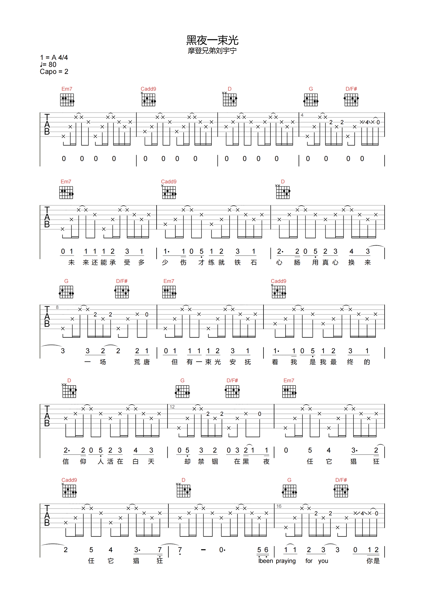 曲谱介绍: 刘宇宁《黑夜一束光》吉他谱,选用G调指法,CAPO夹2品弹唱原调A调,速度80BPM,节奏4/4拍,带前奏原版编配。下方附本谱的PDF下载。
