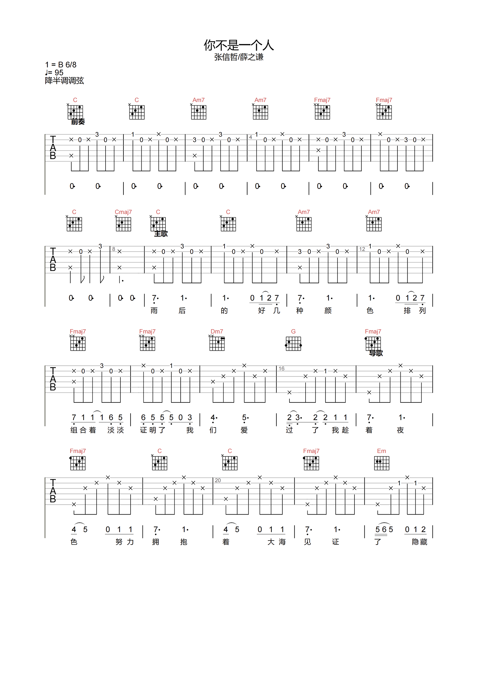 曲谱介绍: 你不是一个人吉他谱,薛之谦/张信哲合唱的歌曲,张信哲的嗓音明亮有力,薛之谦则更加深邃而又叙事性,二者的细腻交织,突破了传统合唱模式而采用了更加精妙的镜像式音声设计,将歌曲中炙热的温度与情感娓娓道来,为听众们带来更丰富的完美体验。 《你不是一个人》吉他弹唱谱,选用C调指法编配,弹唱降半音调弦可以弹唱原调,速度95BPM,节奏6/8拍,带前奏原版编配,难度3级较简单。下方附有PDF版本下载。