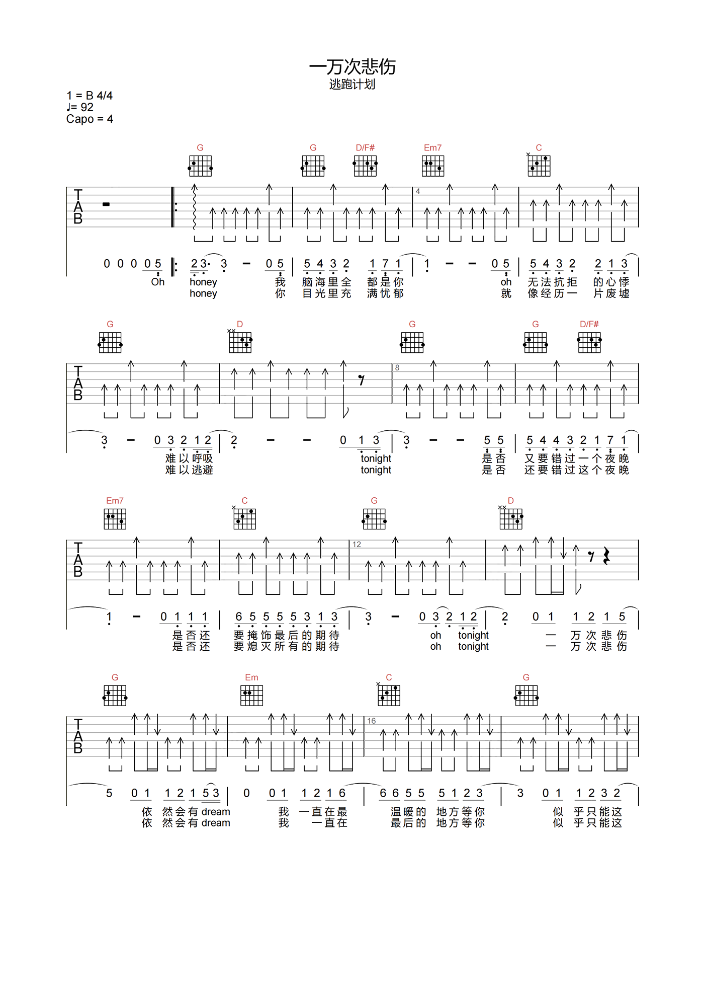 曲谱介绍: 《一万次悲伤》由逃跑计划创作并演唱,词浅显易懂,并没有华丽的辞藻。 逃跑计划《一万次悲伤》吉他谱,选用G调指法,CAPO夹4品弹回原调B调,节奏4/4拍,速度92拍每分钟,全曲扫弦节奏贯穿,难度4级较简单。下方另附本曲谱的PDF下载。