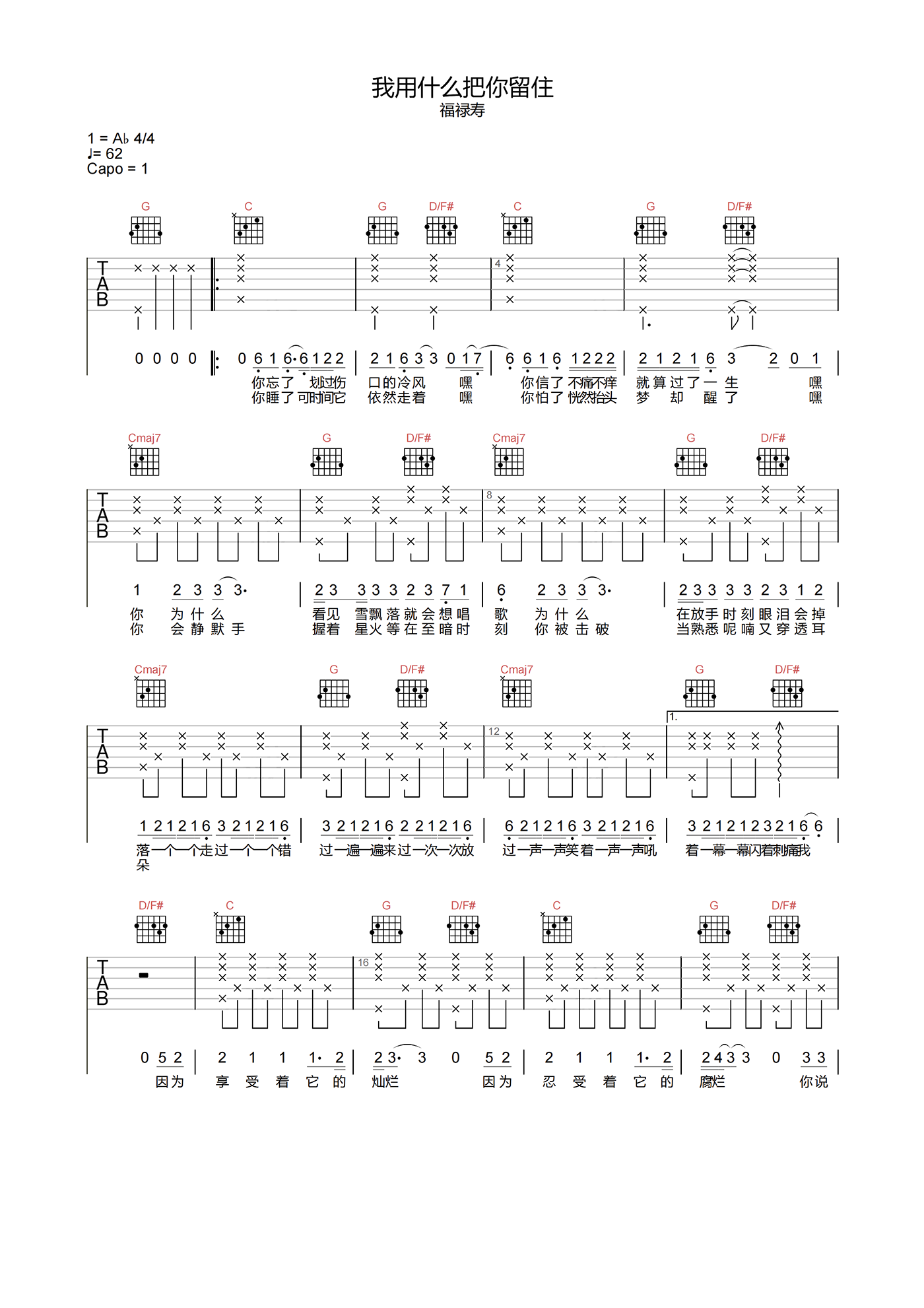 我用什么把你留住吉他谱 - 福禄寿 - G调吉他弹唱谱 - 原版
