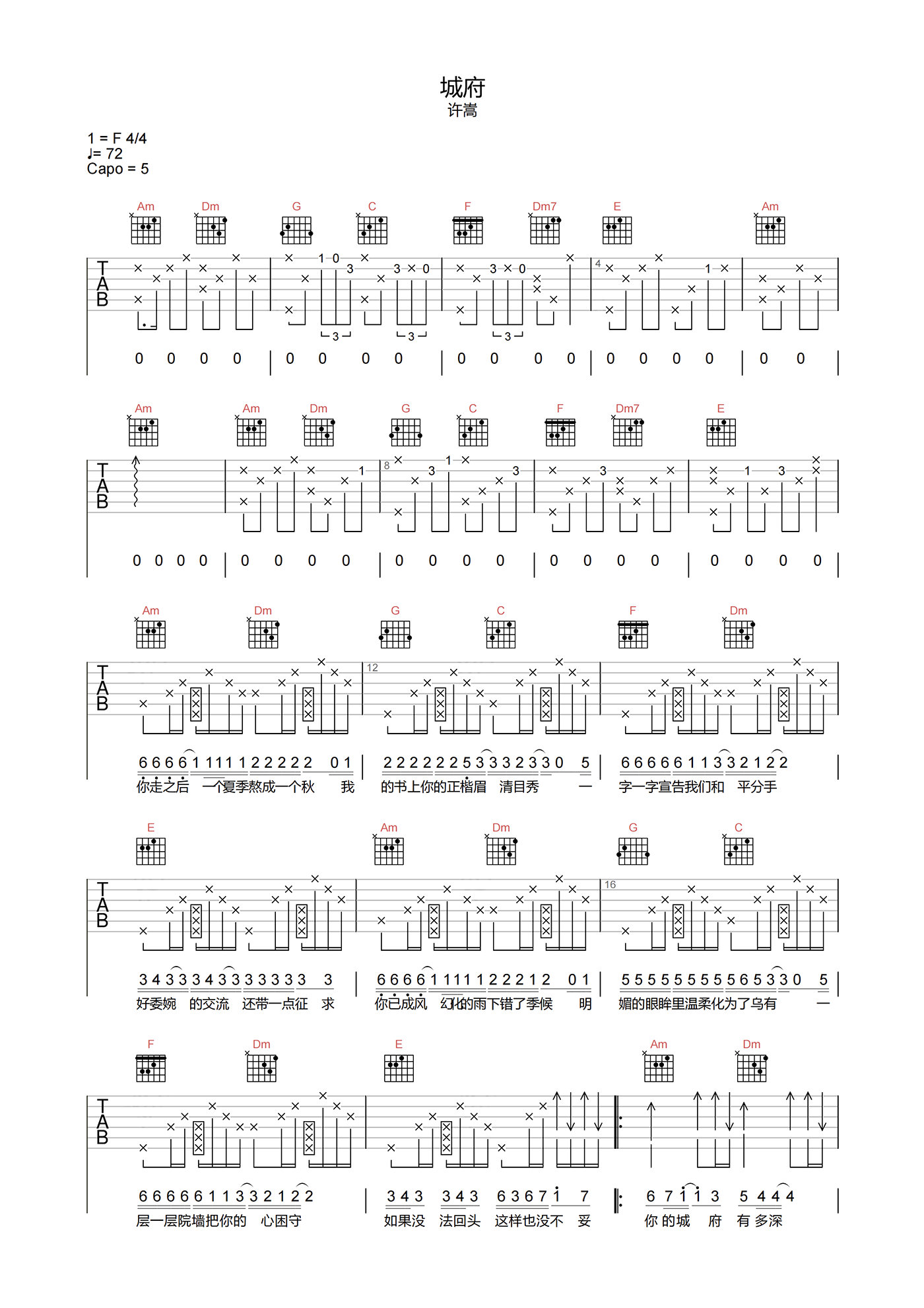 曲谱介绍: 城府吉他谱,许嵩演唱,选用C调指法,原调F调,速度72拍每分钟,节奏4/4拍,弹唱建议CAPO夹5品弹回原调,带前奏原版编配,难度3级较简单。