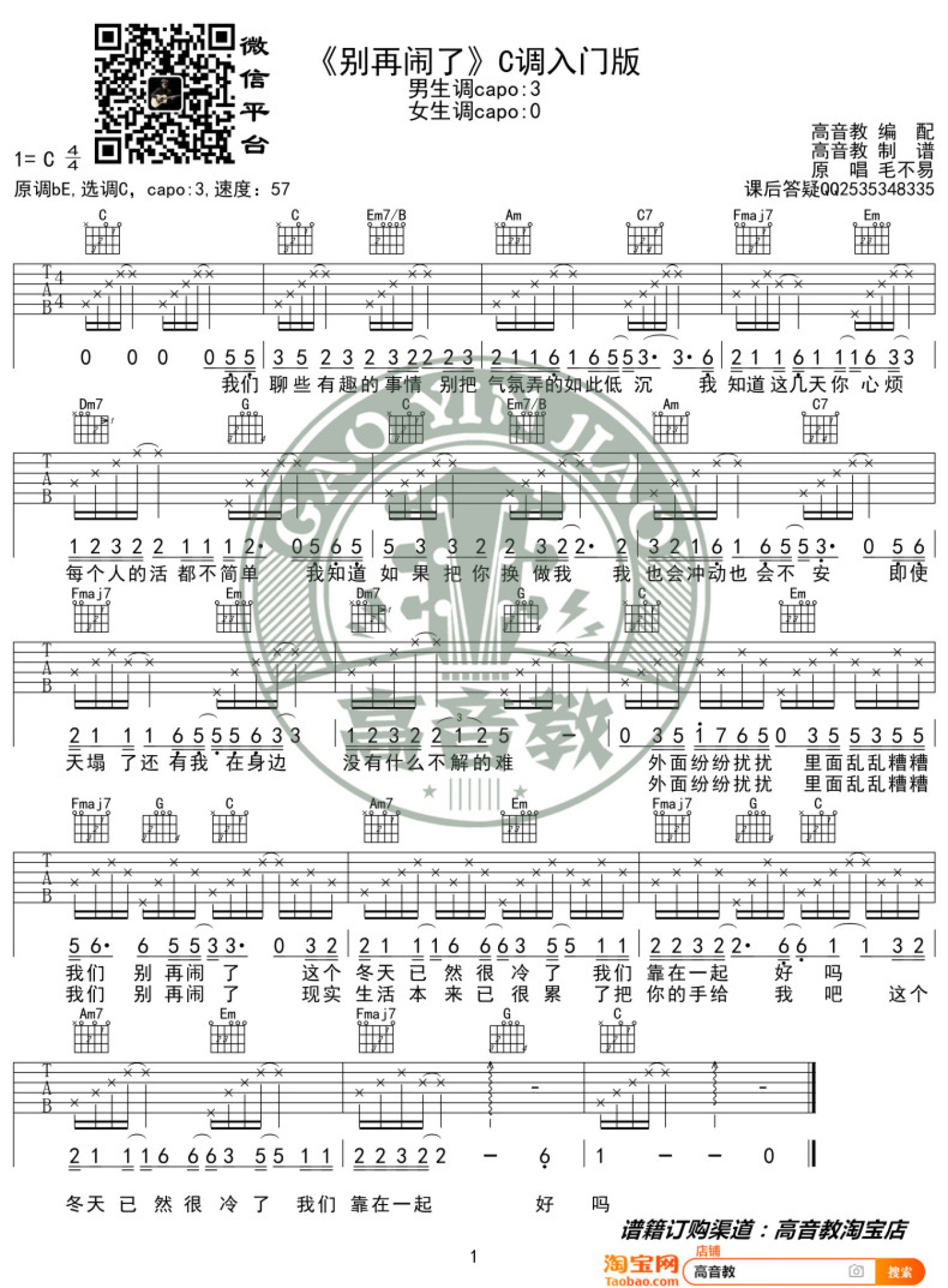别再闹了吉他谱 - 毛不易 - C调吉他弹唱谱