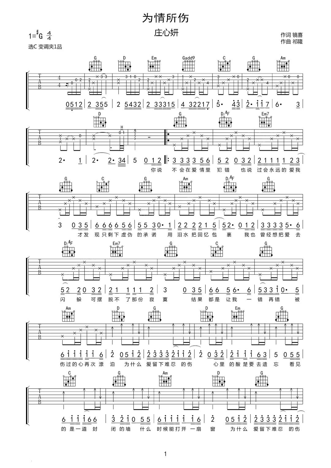 为情所伤吉他谱 - 庄心妍 - C调吉他弹唱谱