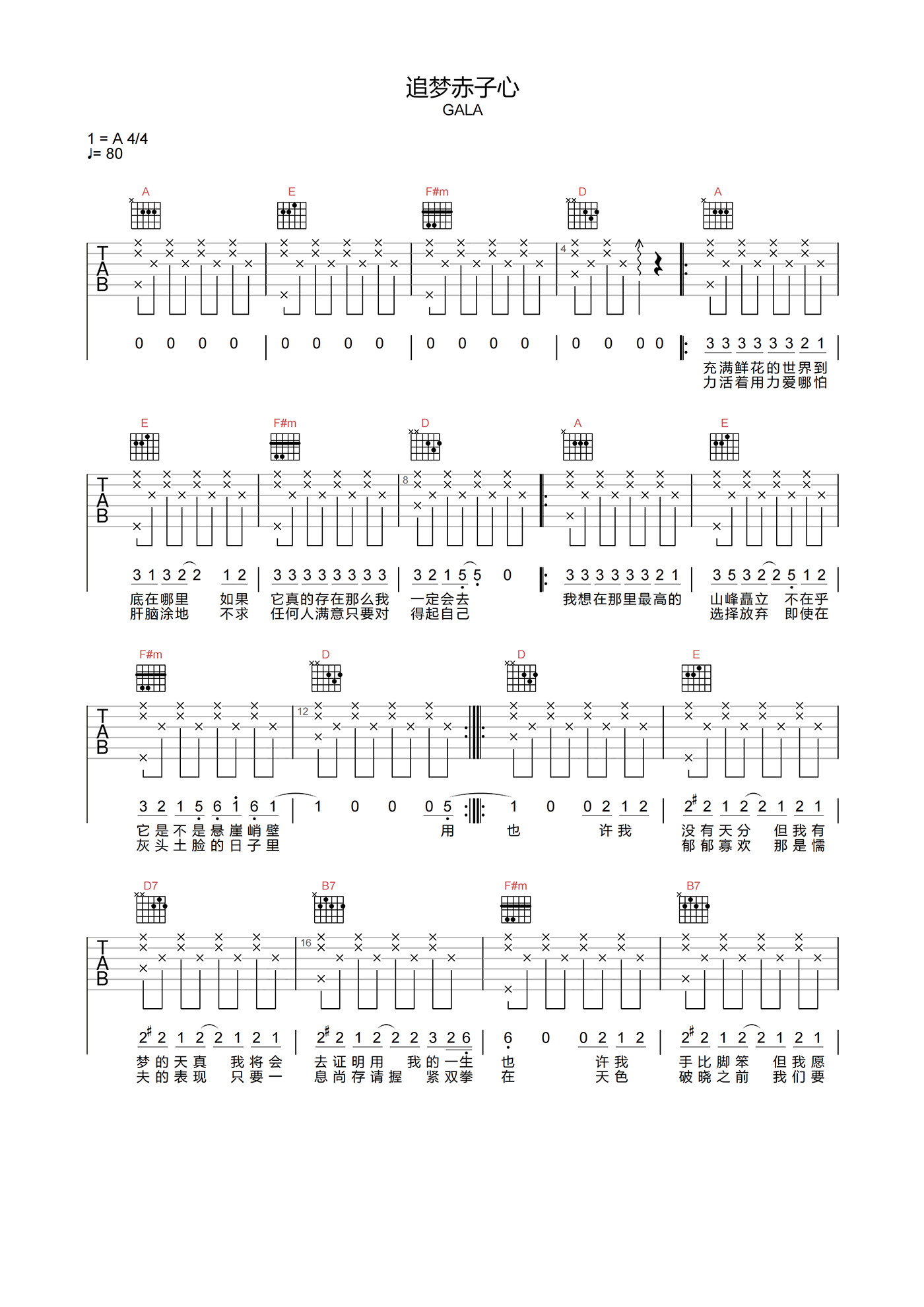 曲谱介绍: 《追梦赤子心》激昂的旋律配合着歌词充满了力量,心中总会有种感受,在催着我们坚持不懈的继续努力奋力向前。 《追梦赤子心》吉他谱,GALA乐队演唱,选用A调指法,标准原调调音,无需使用变调夹,节奏4/4拍,速度80拍每分钟,难度3级较简单。