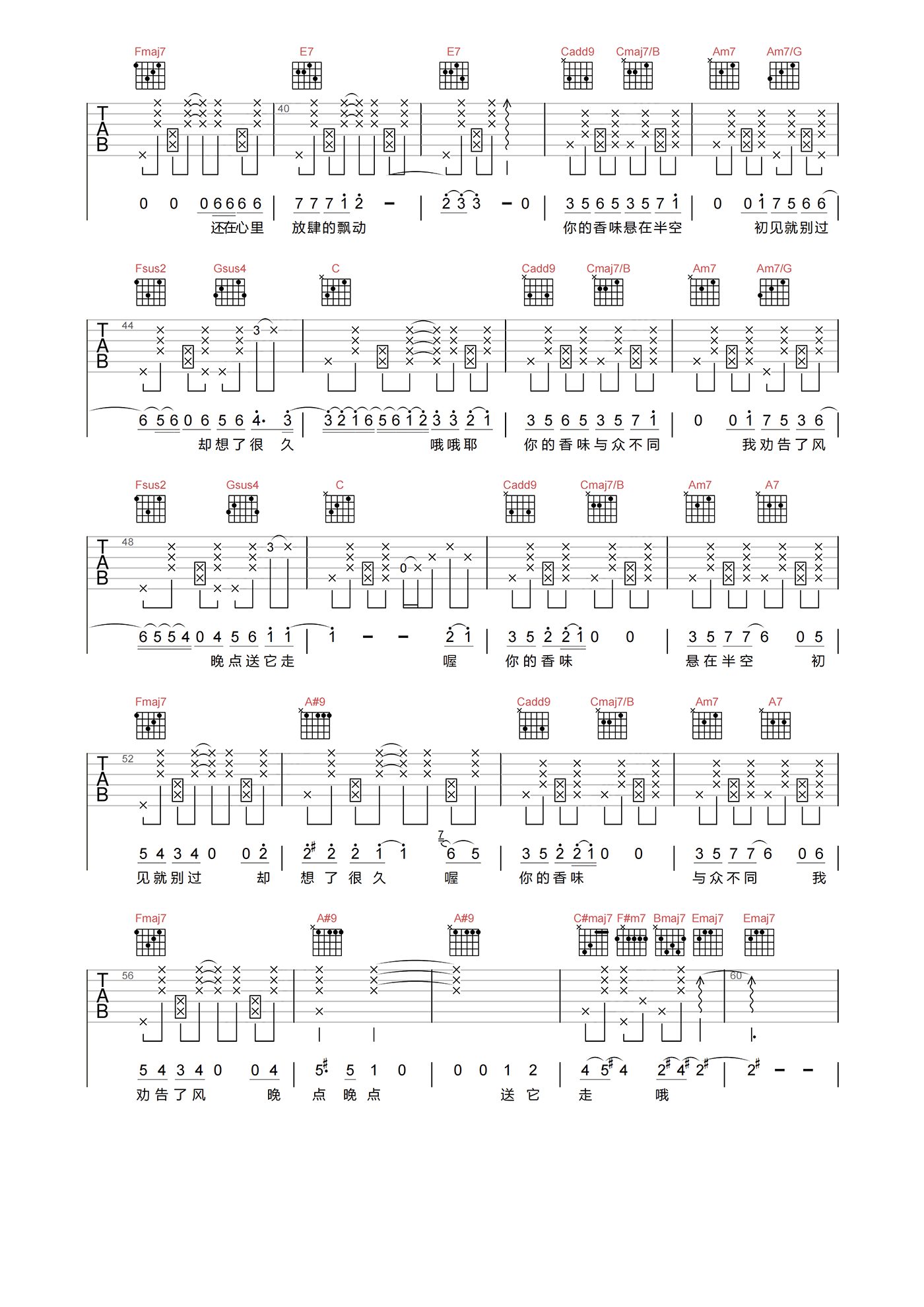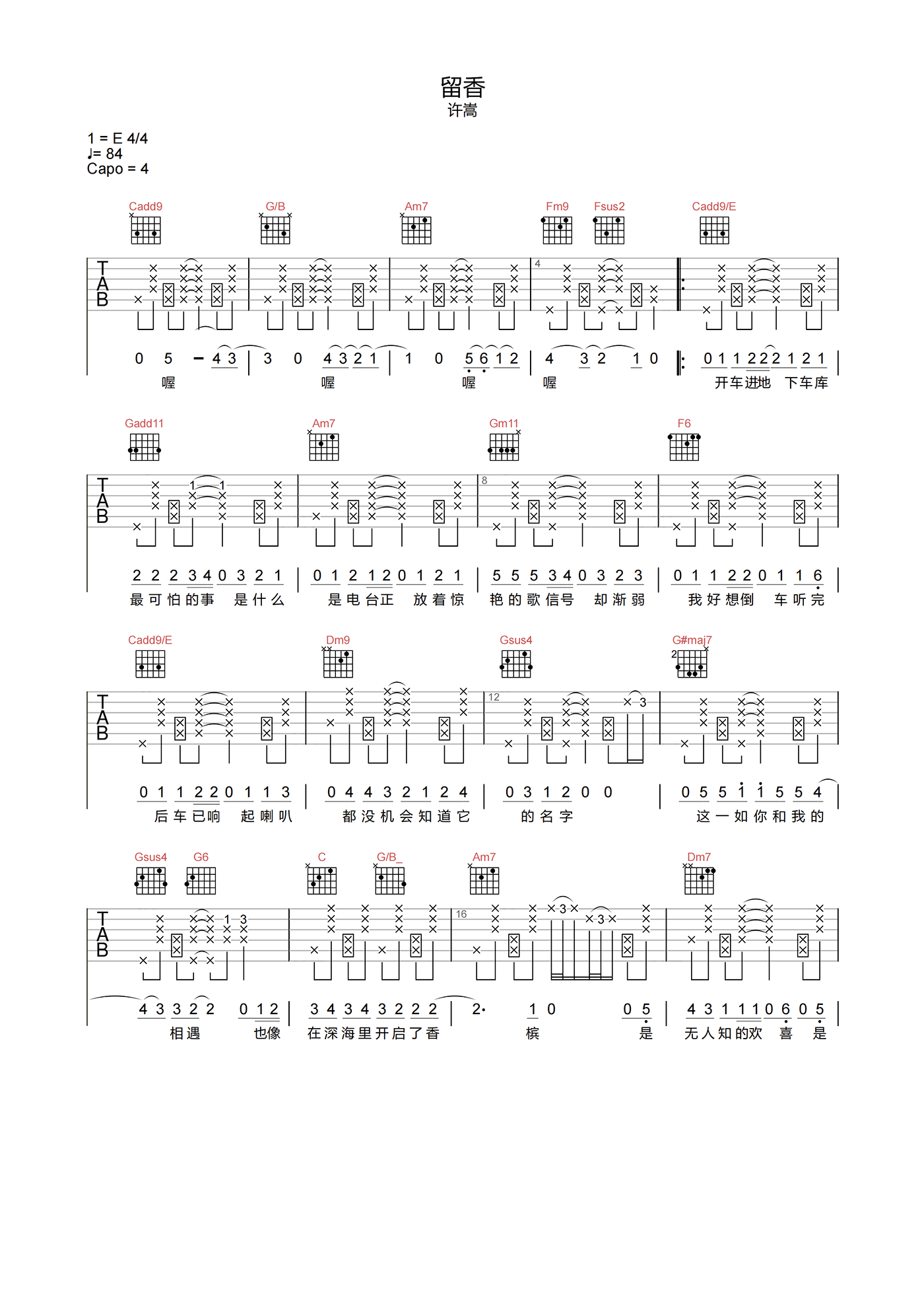 曲谱介绍: 《留香》从口语式的设问启始,撷取极其细微的生活场景和感受来描写内心想法,细腻与轻松兼得。歌里的情绪味道也如同歌里那与众不同的香水味,丰富的层次里有浪漫,有些许遗憾,无法笼统概括,却有着长长的后劲。 留香吉他谱,许嵩演唱,选用C调指法,原调E调,速度84拍每分钟,节奏4/4拍,拍弦节奏编配,难度5级适中。