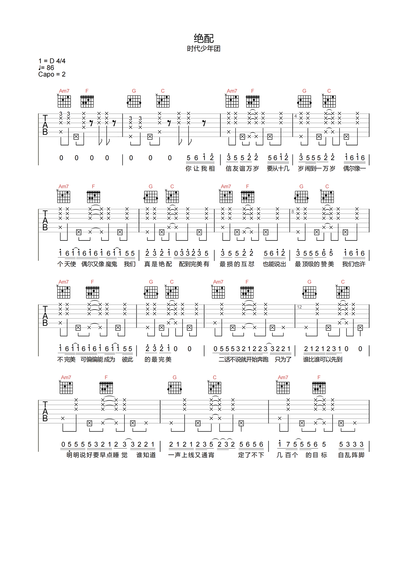 曲谱介绍: 《绝配》歌曲带给人一种青春的活力,可以是表明生活中有很多绝配的时候,也可以是很好地展示了少年们的之间的感情,也从点点滴滴中很好的展示了歌曲中的歌词“友谊万岁”。 绝配吉他谱,时代少年团演唱,选用C调指法,原调D调,速度86拍每分钟,节奏4/4拍,弹唱涉及到拍弦技巧,难度5级适中。