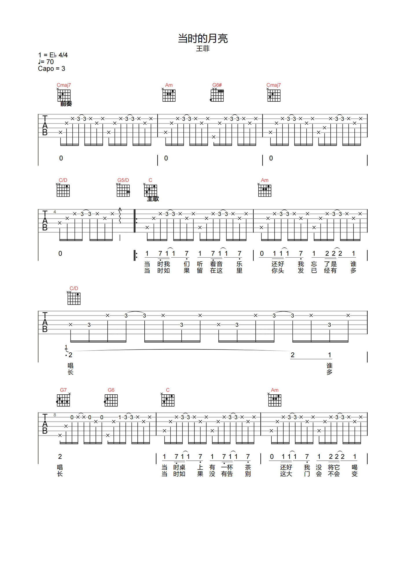 当时的月亮吉他谱 - 王菲 - C调吉他弹唱谱 - 原版