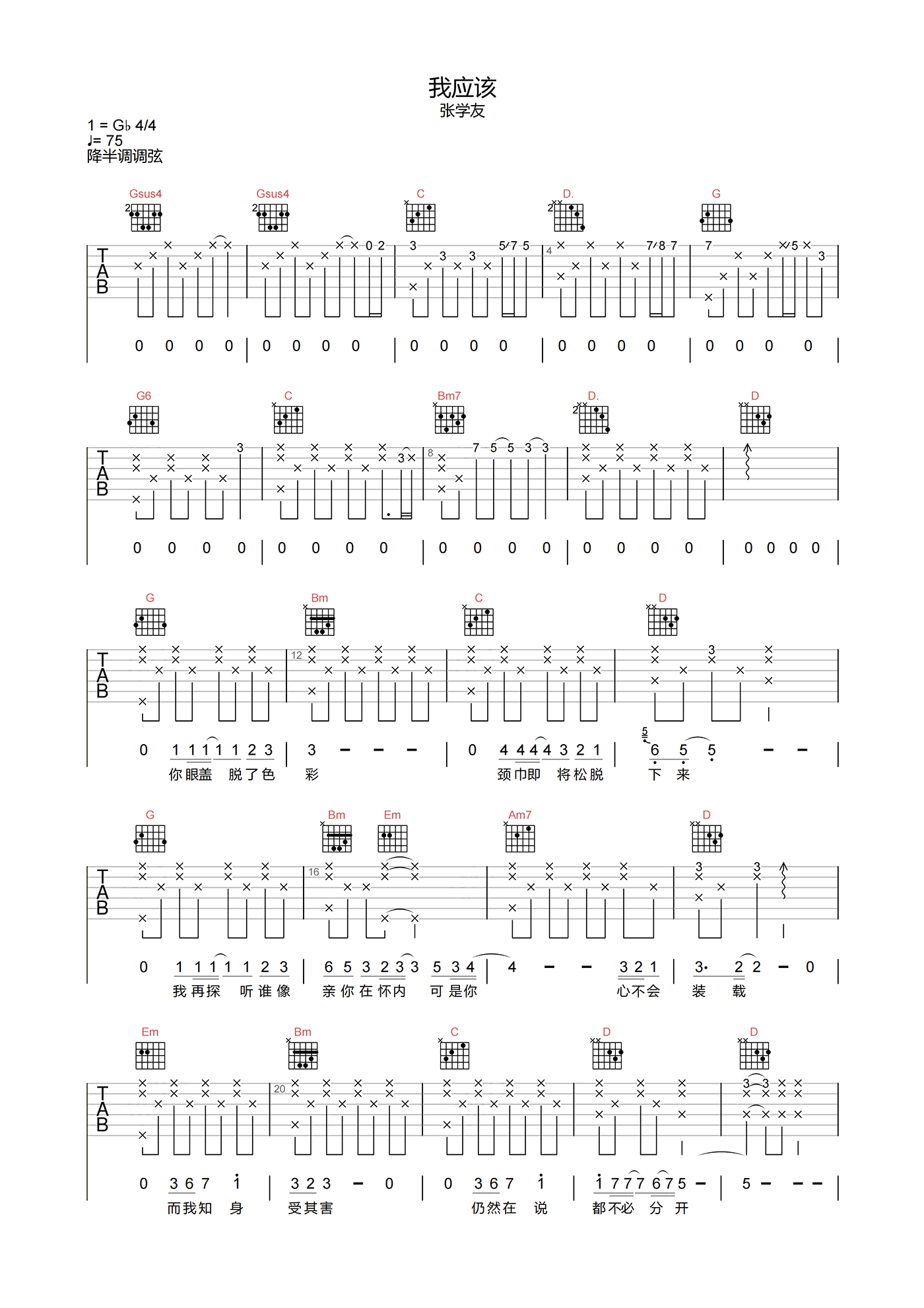 曲谱介绍: 我应该吉他谱,张学友演唱的粤语歌曲,选用G调指法编配,弹唱建议降半音调弦可弹回原调,带前奏原版编配,难度5级适中。本页下方附曲谱的PDF下载。 《我应该》平缓上升的情绪抓住了每一个人的共鸣,那些曾经哭过、笑过、爱过、恨过的往事都已随风飘散,但也许静下心的梳理会更让自己清楚此刻的自己应该不能走错路。