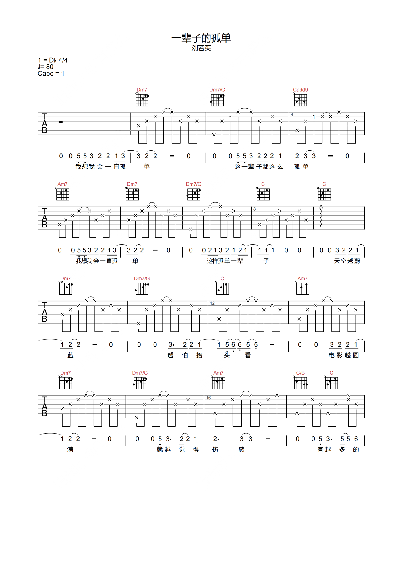 曲谱介绍: 《一辈子的孤单》由刘若英演唱,洒脱的演唱形式似乎没有照应歌名的主题,歌曲以顺应接受的方式唱着大家内心都存在过的恐惧,孤单并不可怕,怕的是你决不允许孤单的存在。 刘若英《一辈子的孤单》吉他谱,选用C调指法,原调bD,CAPO夹1品弹唱原调,节奏4/4拍,速度80拍每分钟,按原版编配,难度3级较简单,共有5张高清吉他六线谱图例,下附本曲谱PDF下载。