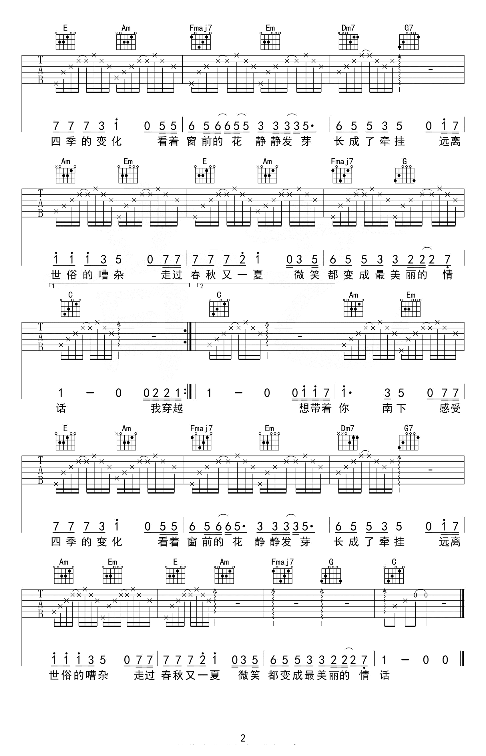曲谱介绍: 《南下》这一首民谣歌曲,描绘的是南方的美丽画面,每句话都听出软绵绵的情意。 南下吉他谱,徐海俏演唱,选用C调指法,原调F调,带前奏按原版编配,节奏4/4拍,共2张高清吉他六线谱图例,难度3级较简单,下方有本曲谱的PDF下载。
