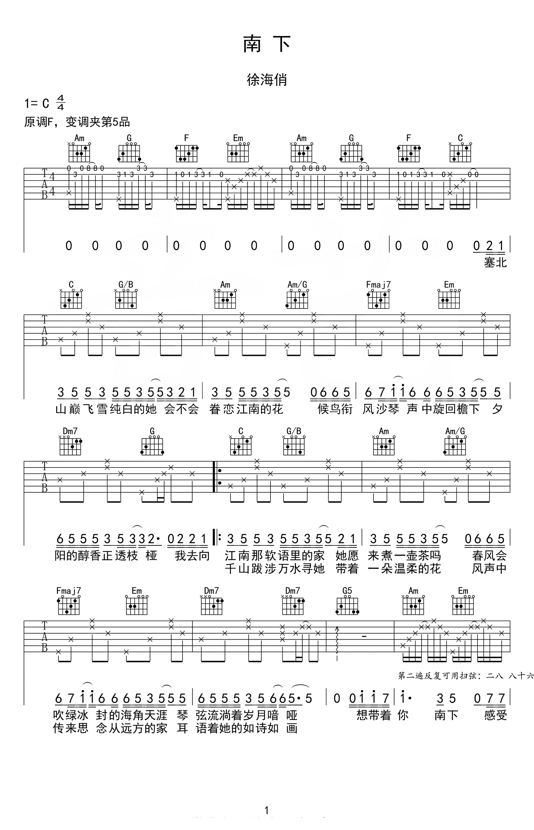 南下吉他谱 - 徐海俏 - C调吉他弹唱谱 - 原版