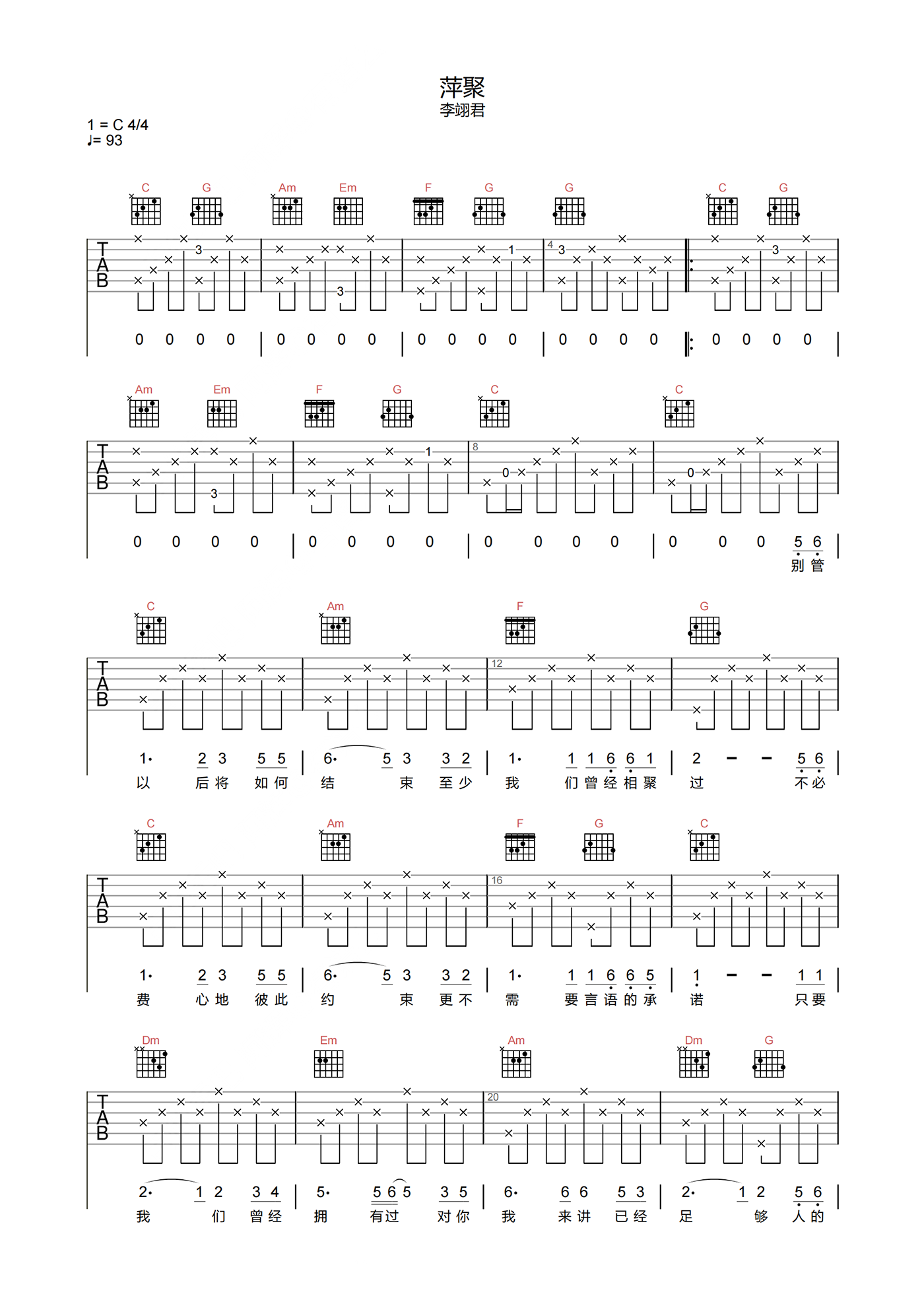 萍聚吉他谱 - 李翊君 - C调吉他弹唱谱 - 原版