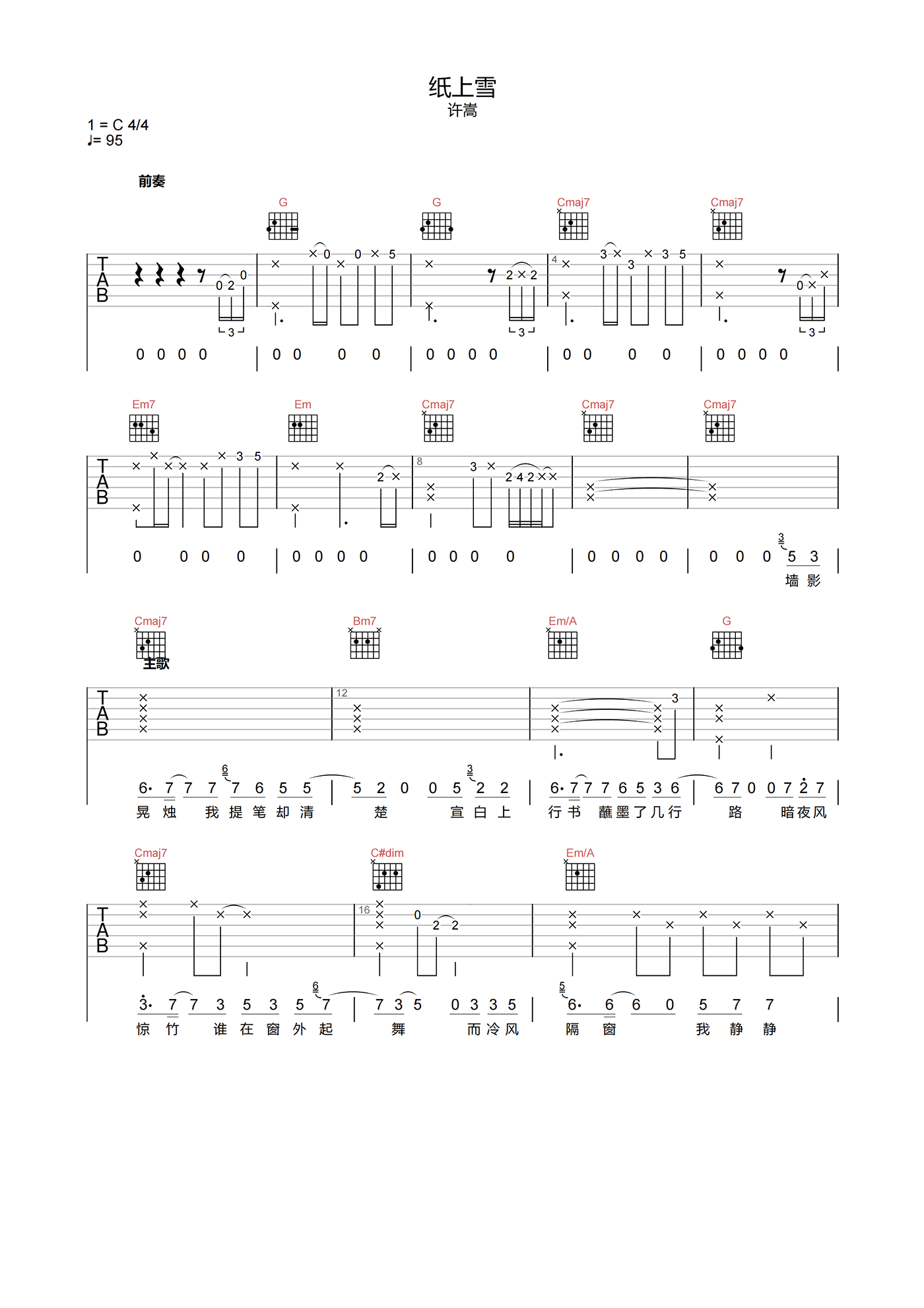纸上雪吉他谱 - 许嵩 - C调吉他弹唱谱 - 原版