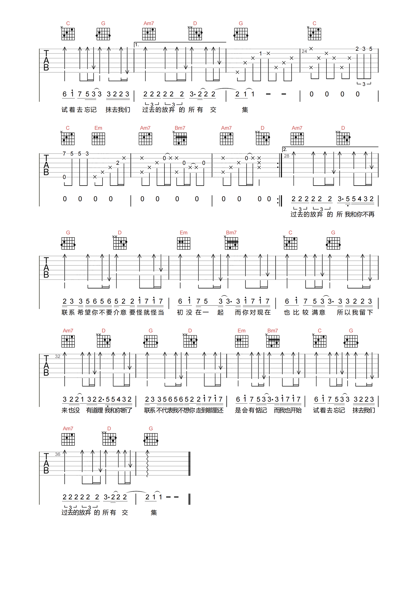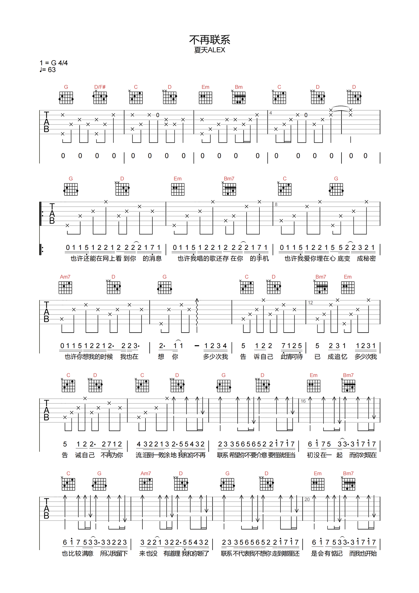 不再联系吉他谱 - 夏天ALEX - G调吉他弹唱谱 - 原版