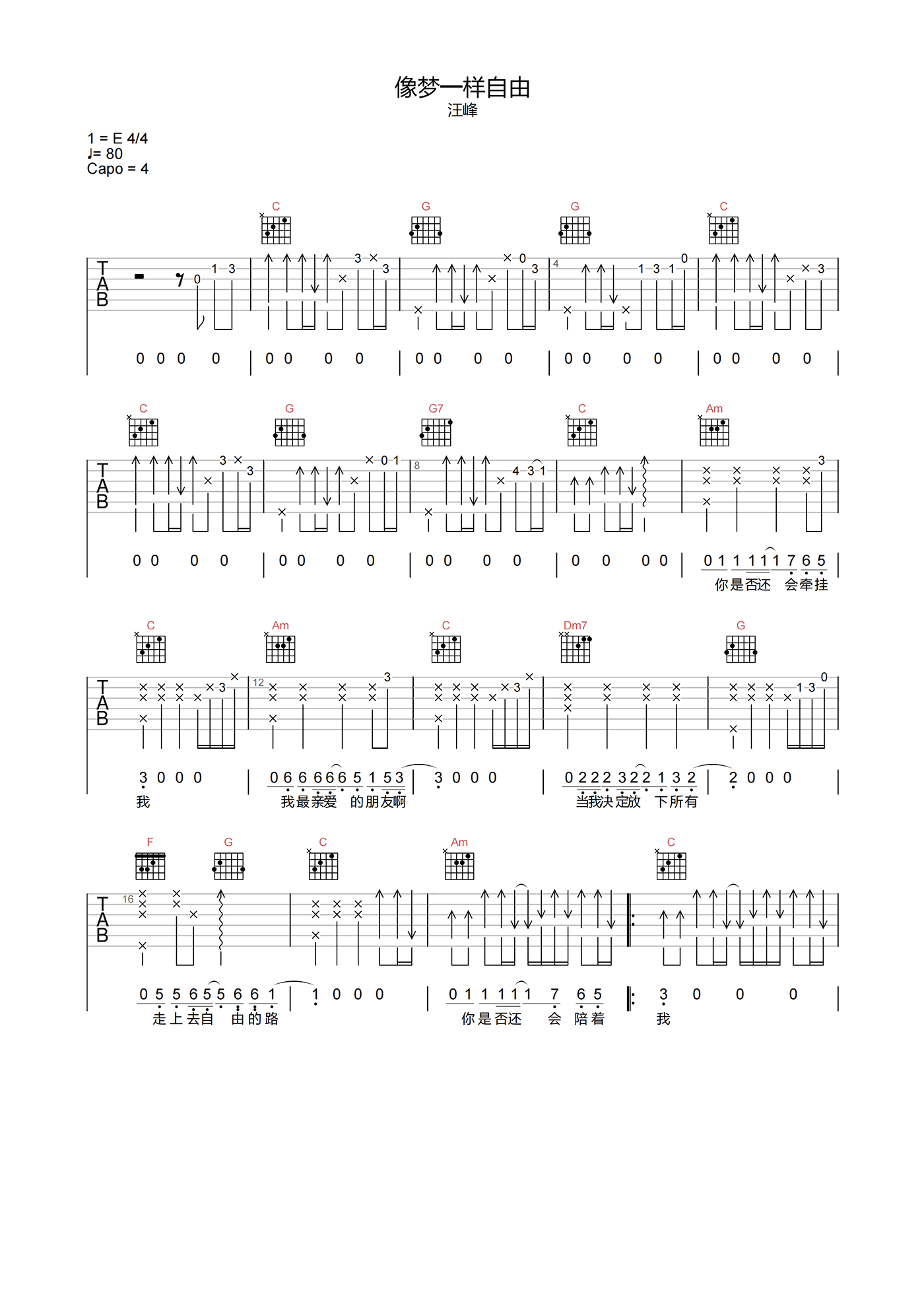 曲谱介绍: 《像梦一样自由》由汪峰演唱的正能量歌曲,汪峰以自己的角度诠释着有梦想的态度! 汪峰《像梦一样自由》吉他谱,选用C调指法,原调E调,节奏4/4拍,速度80拍每分钟,CAPO建议夹4品弹回原调,本谱带前奏按原版编配,难度5级适中,下方附曲谱的PDF下载。