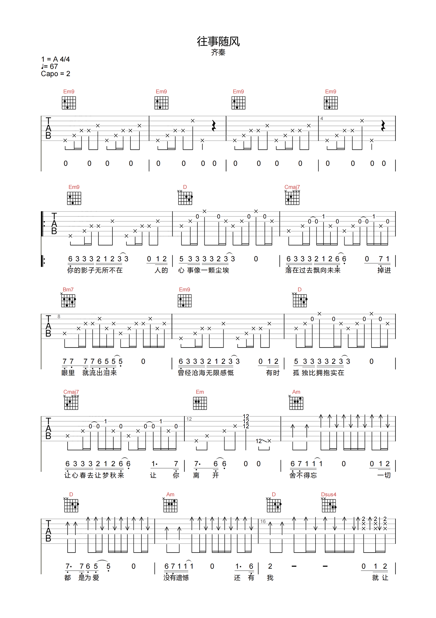 曲谱介绍: 往事随风吉他谱,齐秦演唱,这首歌用洒脱从容的方式仿佛在怀缅曾经的爱情,就让一切陈年往事随风风走,也许在未来的某一天还会想起,但它已经被放入了心底。 《往事随风》吉他弹唱谱,选用G调,原调A调,节奏4/4拍,速度67拍每分钟,CAPO夹2品弹唱原调,带前奏原版编配,难度3级较简单,共3张高清吉他六线谱图例,下方另附PDF下载。