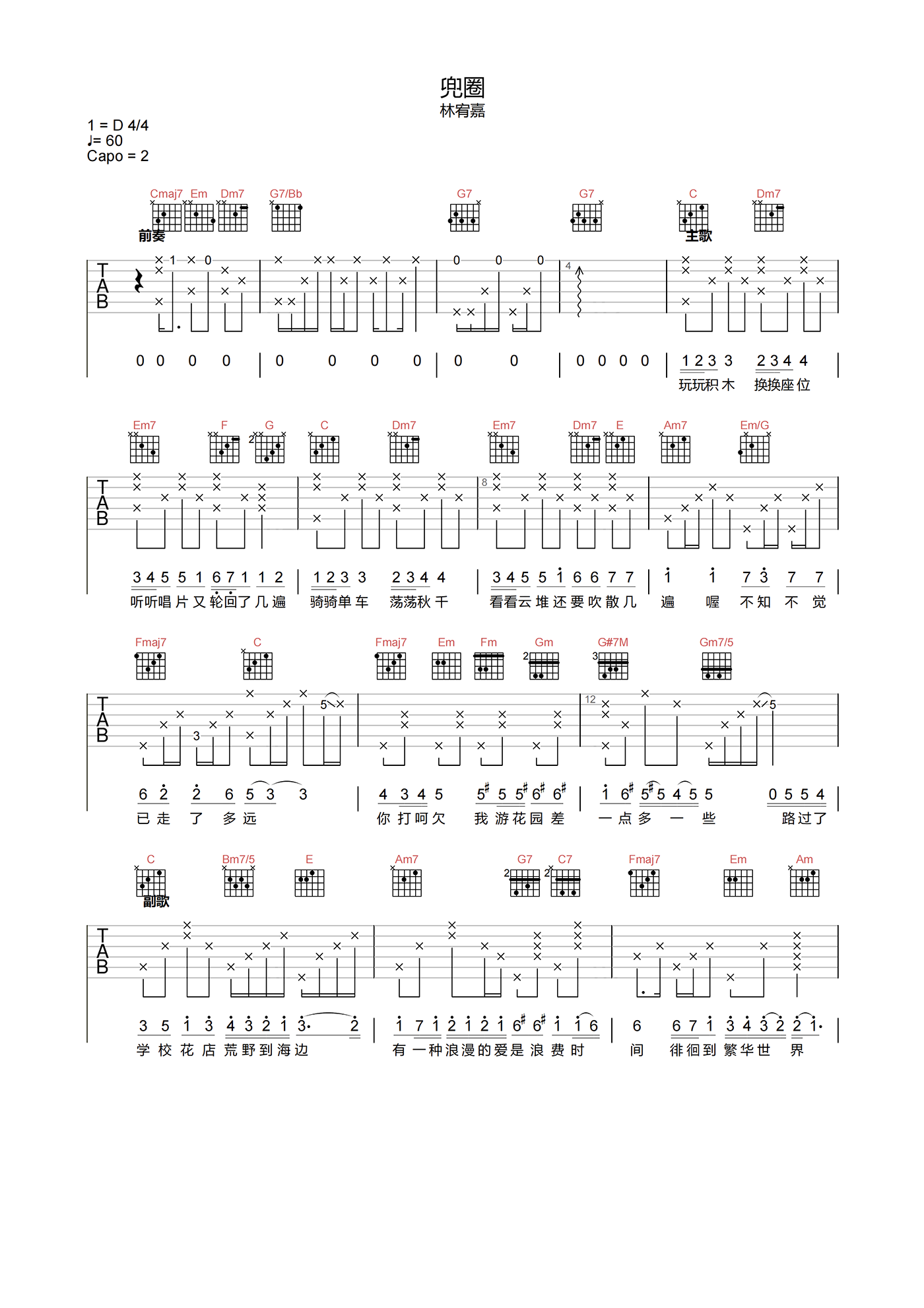 曲谱介绍: 《兜圈》由林宥嘉演唱,台湾偶像剧《必娶女人》片尾曲,林宥嘉用“兜圈迂回”的方式把自己的故事塞入歌中,我们也许在渐渐长大后才能明白,曾经的那些兜兜转转,现在这个浮躁年代来看,是那么的可贵。 兜圈吉他谱,选用C调指法,原调D调,速度60拍每分钟,节奏4/4拍,CAPO建议夹2品,带前奏原版编配,难度4级较简单,共有4张高清吉他六线谱图例,下方附曲谱PDF下载。