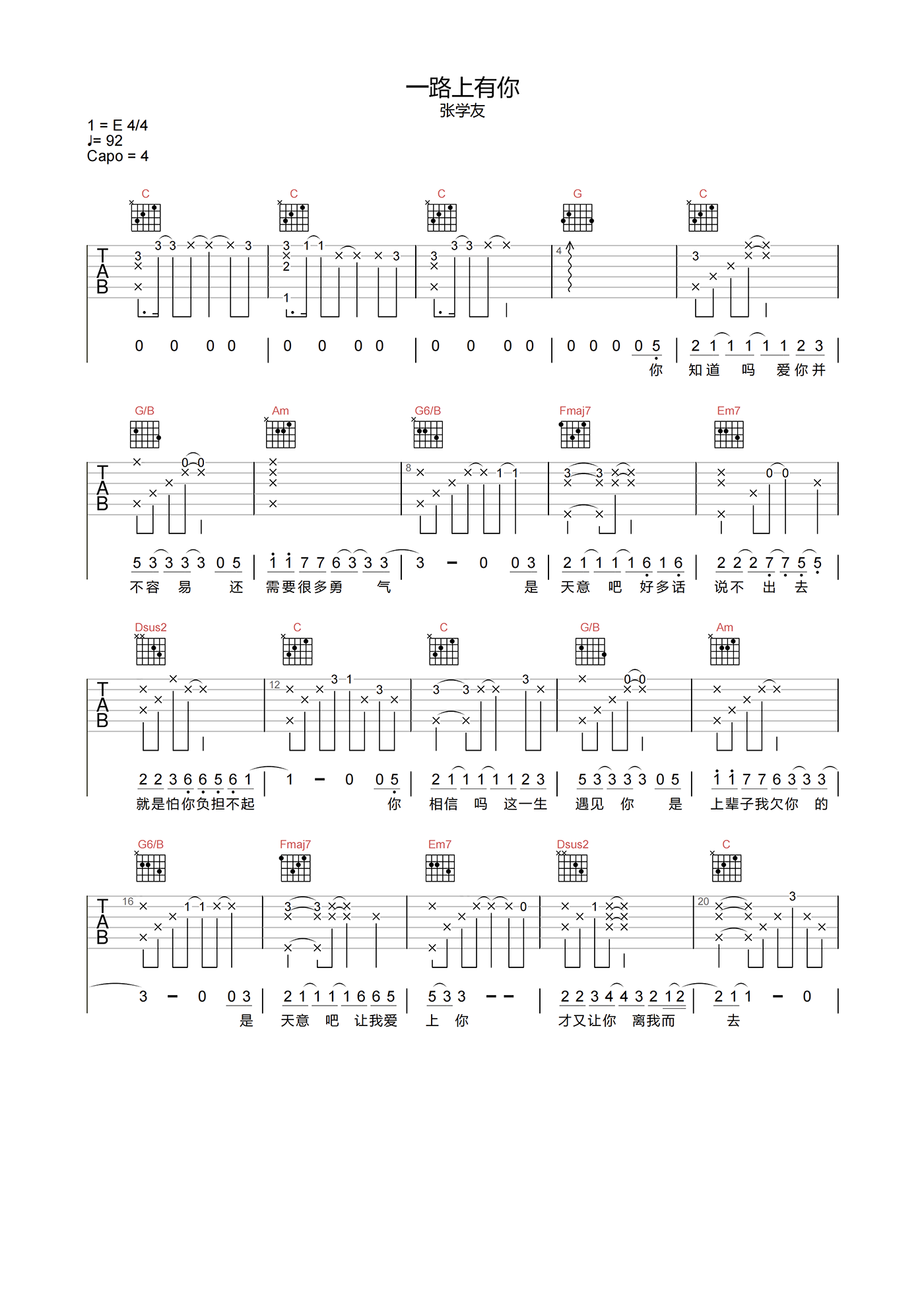 曲谱介绍: 张学友《一路上有你》,苦中拔出了入心的深情,爱情这一路上总会崎岖坎坷,经过风雨必定会遇到属于自己的彩虹。而这首歌正好诠释着在感情经历这个路途上相伴的际遇。 《一路上有你》吉他谱,张学友演唱,选用C调,原调E调,CAPO建议夹4品弹回原调,带前奏原版编配,难度4级较简单。下方附本曲谱的PDF下载。