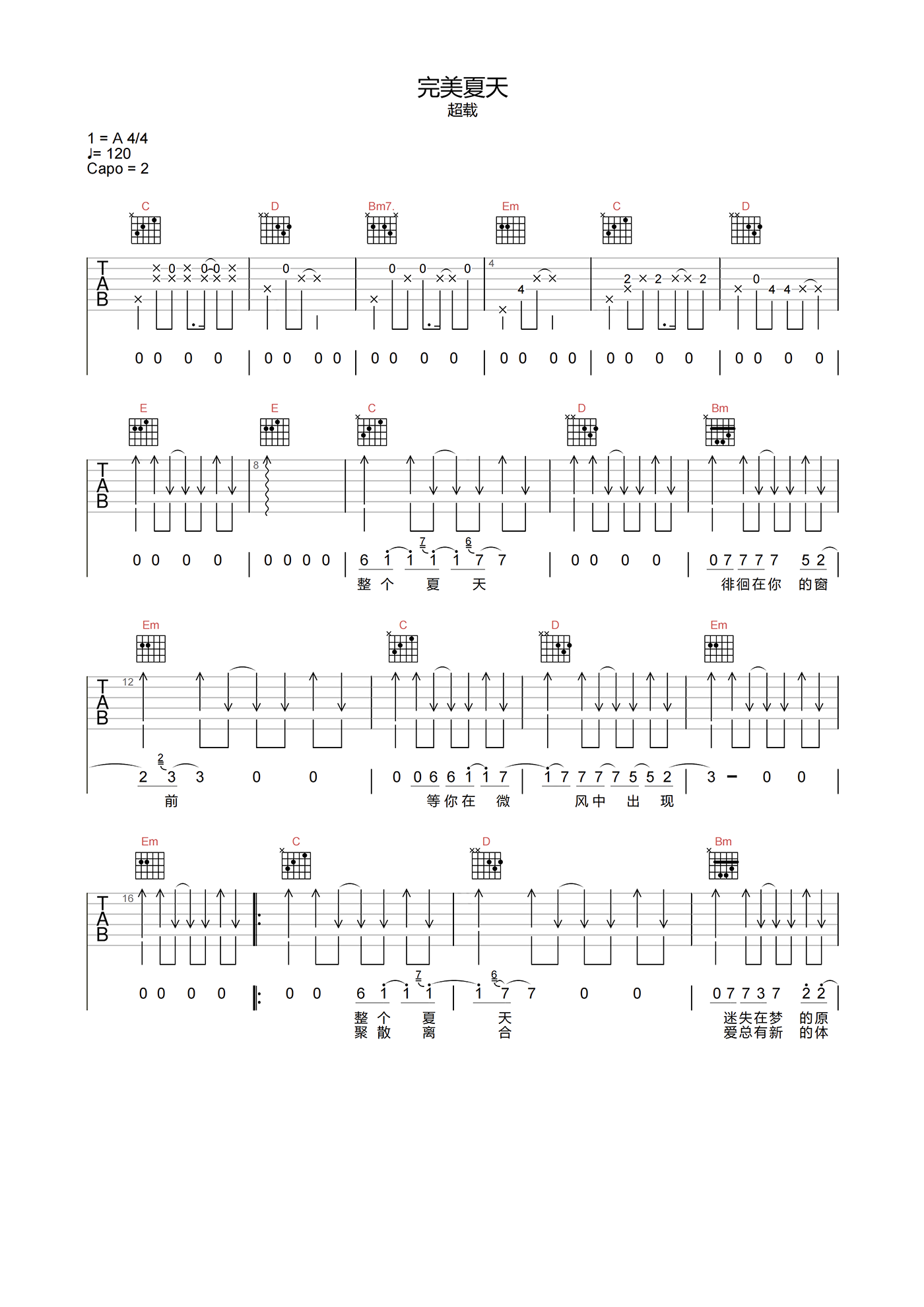 曲谱介绍: 《完美夏天》超载乐队原创并演唱的歌曲,滚躺着很容易爱上的流行色彩,真挚而朴实,坦白而透明的歌词娓娓讲述了一段美丽又让人心碎的爱情。 《完美夏天》吉他谱,超载乐队演唱,选用G调指法,原调A调,速度120拍每分钟,节奏4/4拍,CAPO夹2品弹唱原调,带前奏原版编配,难度4级较简单。